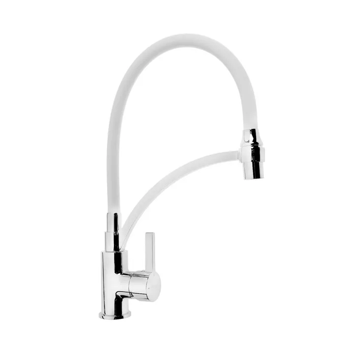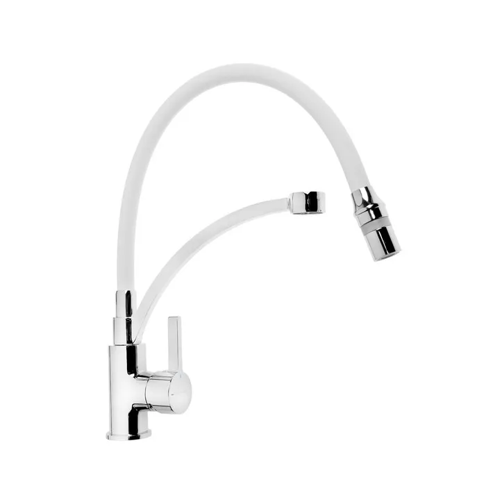 Современная функциональность для вашей кухни! Однорычажный смеситель Accoona с гибким изливом — практичное решение для современной кухни. Сочетание белого и хромированного покрытия создает стильный контраст.