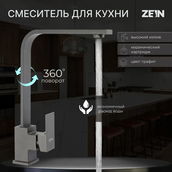 Смеситель для кухни ZEIN Z3764, однорычажный, высота излива 33 см, графит