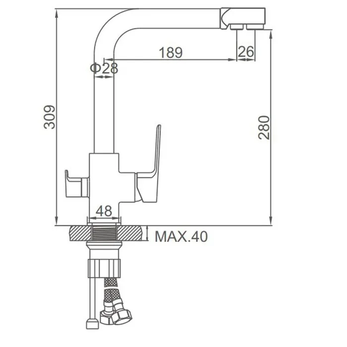 Удобное переключение горячей/холодной воды рычагом позволяет регулировать температуру воды до наиболее комфортных значений одной рукой. Также, с другой стороны смесителя установлен второй рычаг для питьевой воды.