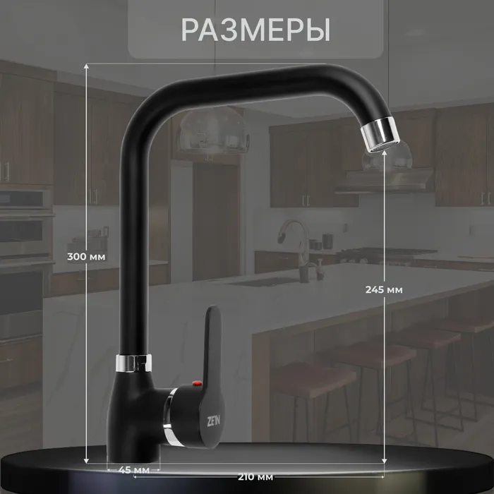 Смеситель для кухни ZEIN Z2228, высокий излив, картридж керамика 40 мм, черный/хром — Характеристики