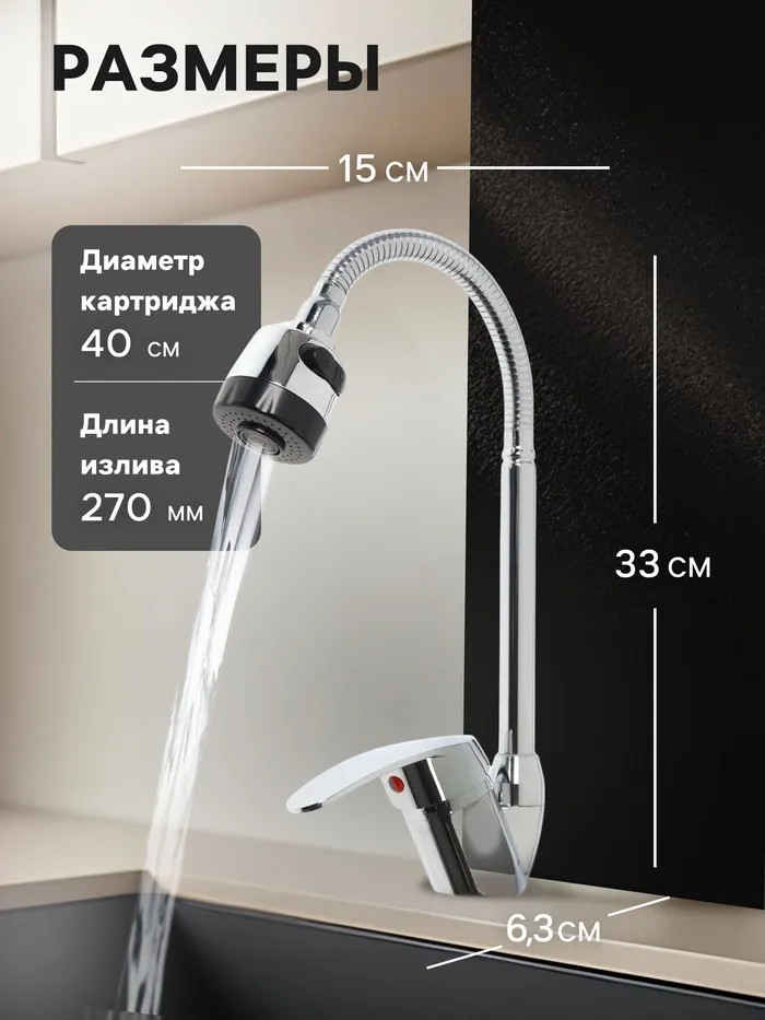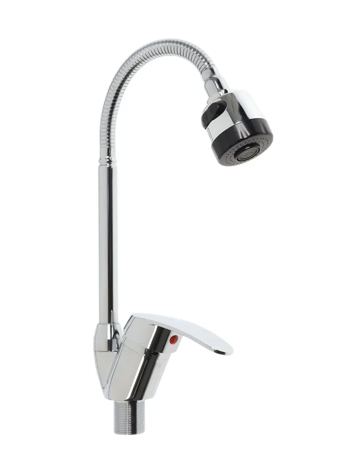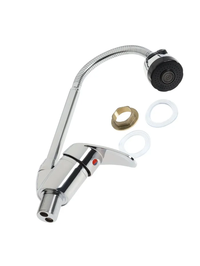 Однорычажный смеситель с длинным гибким изливом устанавливается на кухонную мойку или столешницу. В комплекте крепление на гайке, что упрощает монтаж.