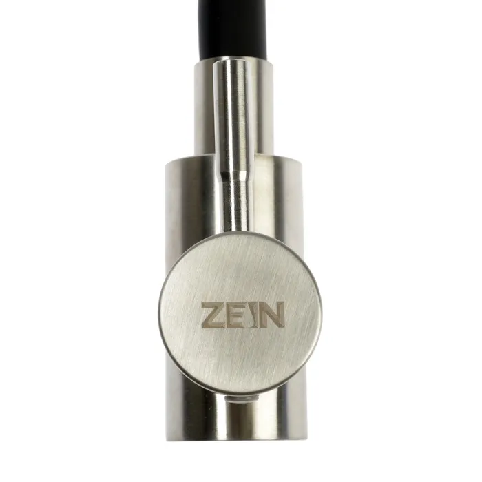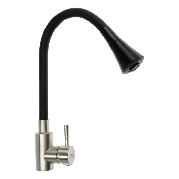 Смеситель для кухни ZEIN изготовлен из нержавеющей стали и предназначен для установки на горизонтальной поверхности — кухонной мойке или столешнице.