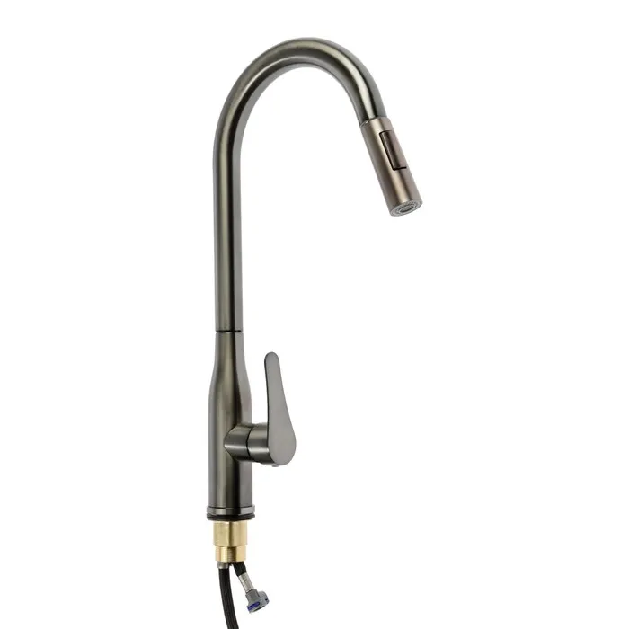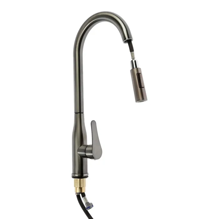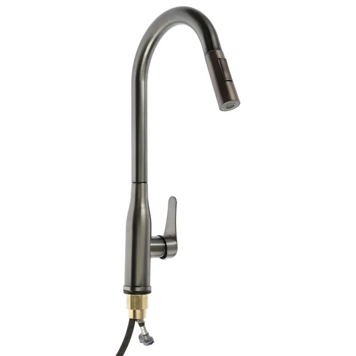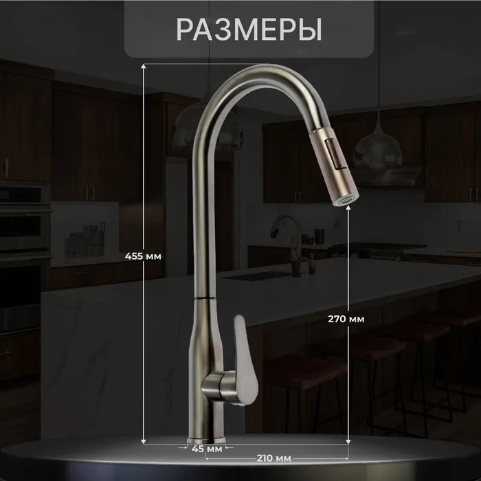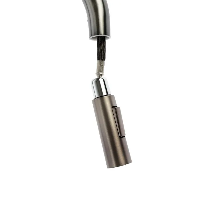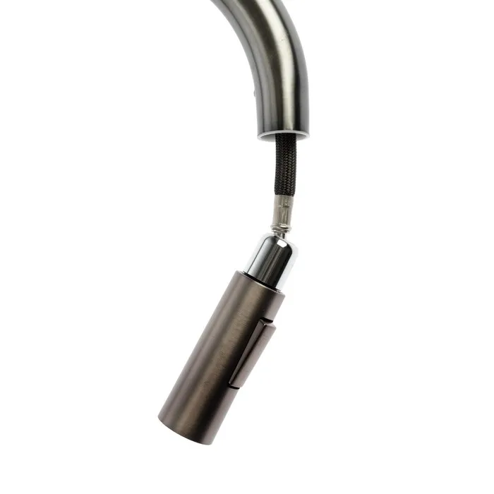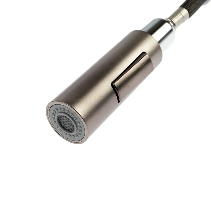 Вытяжной излив добавит функциональности смесителю - можно вымыть объемную посуду, дотянуться до труднодоступных мест и любого содержимого мойки. Также, аэратор имеет два режима подачи воды.