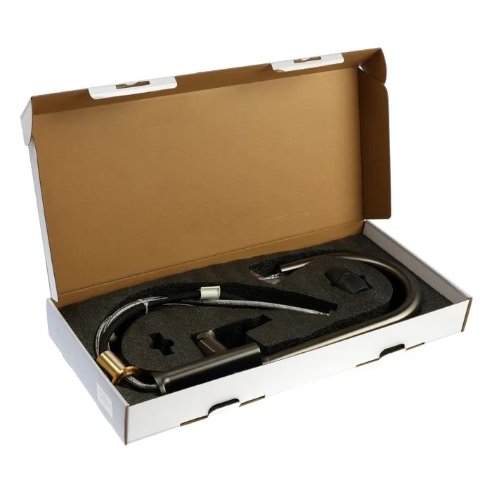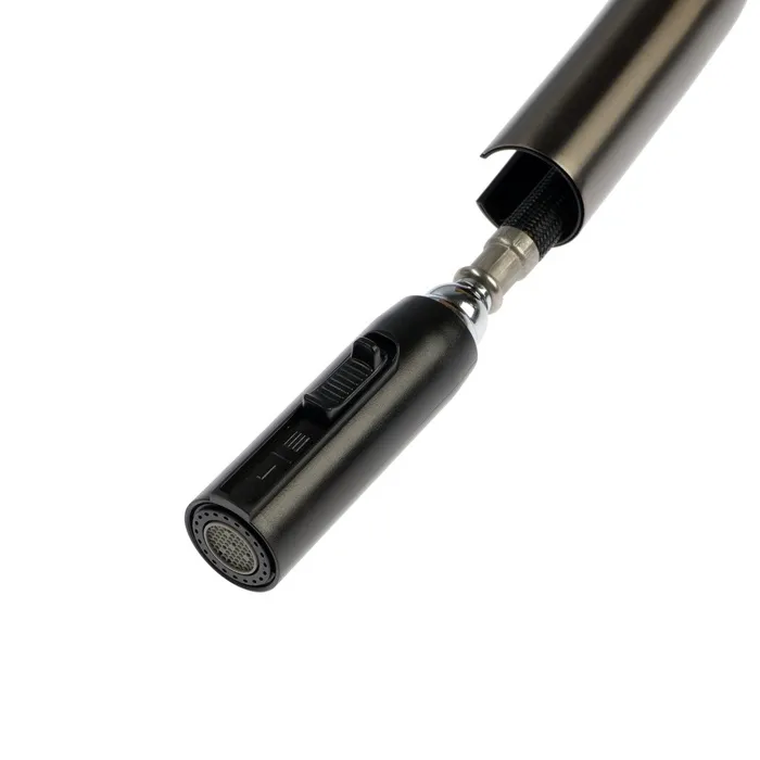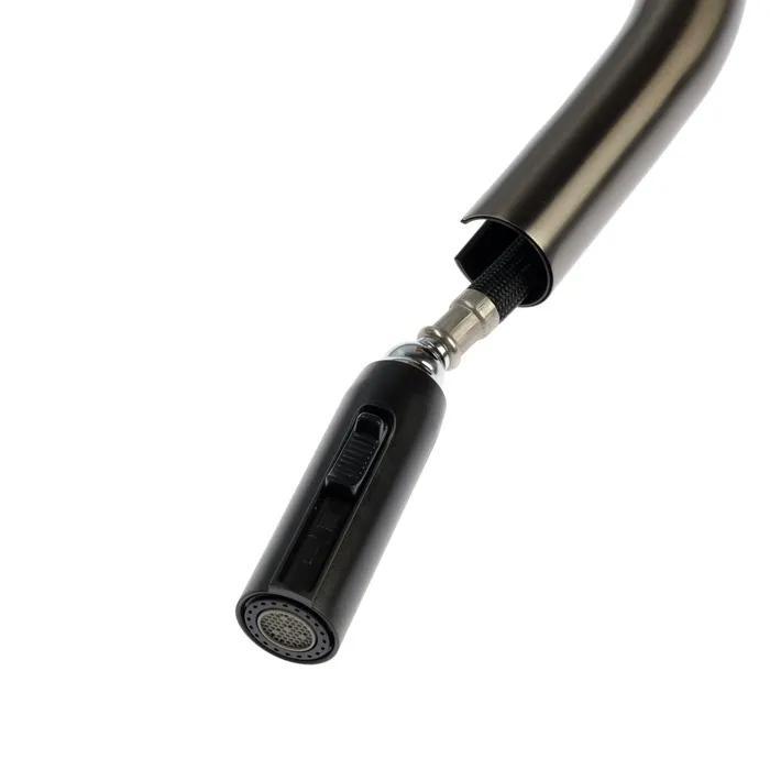 Вытяжной излив добавит функциональности смесителю - можно вымыть объемную посуду, дотянуться до труднодоступных мест и любого содержимого мойки. Также, аэратор имеет два режима подачи воды.