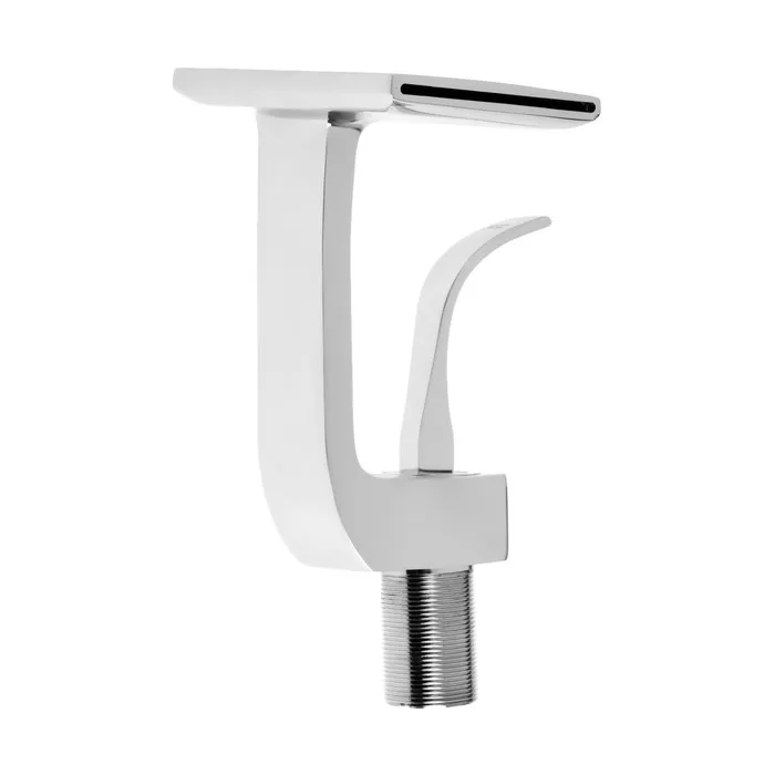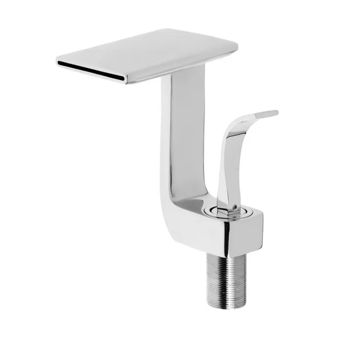 Включение и выключение воды происходит рычагом. Необычная форма излива создает плоскую широкую струю, которую можно сравнить с «водопадом», поэтому поток воды называют каскадный.