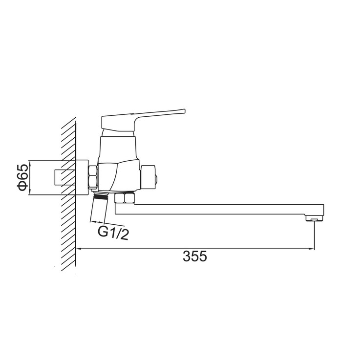 Настенный смеситель имеет длинный поворотный излив и рычаг для регулирования подачи воды. Режим «Душ» переключается поворотом вентиля.