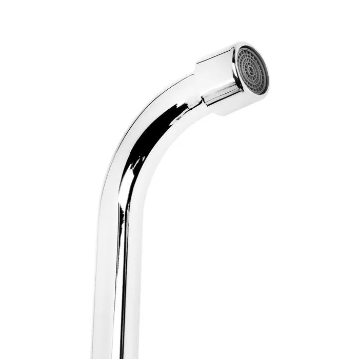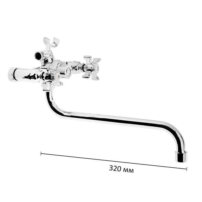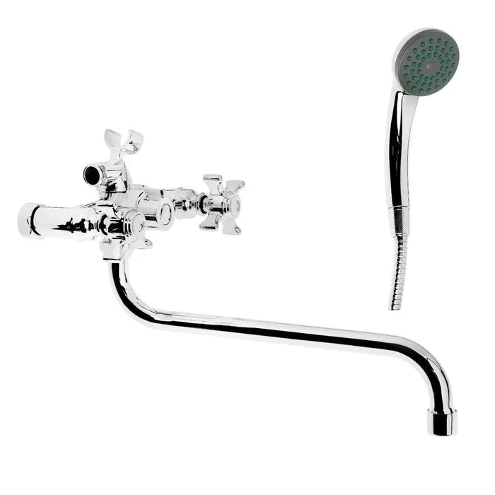 Настенный смеситель имеет длинный поворотный излив и 2 вентиля для регулирования подачи воды. Режим «Душ» переключается поворотом рычага.