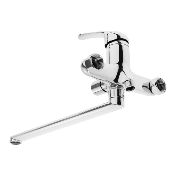 Настенный смеситель для ванны с удлиненным изливом подает воду через кран и душевую лейку. Цинковый корпус с хромированным покрытием обеспечивает долговечность конструкции.