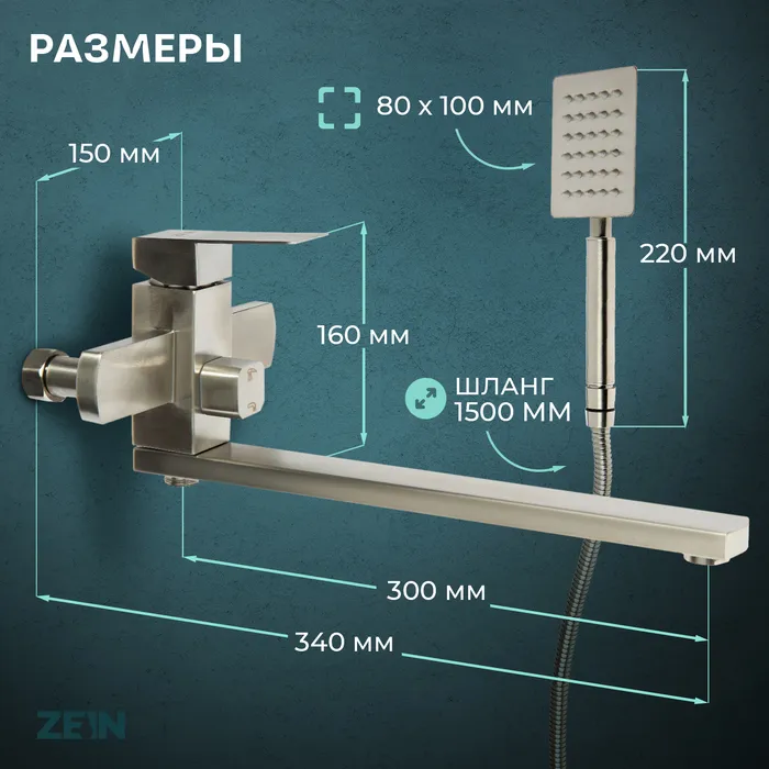 Смеситель для ванны ZEIN с изливом длиной 35 см сочетает в себе стиль и функциональность.