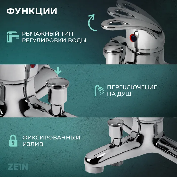 Смеситель для ванны ZEIN Z0153, картридж 35 мм, с душевым набором, хром — Характеристики