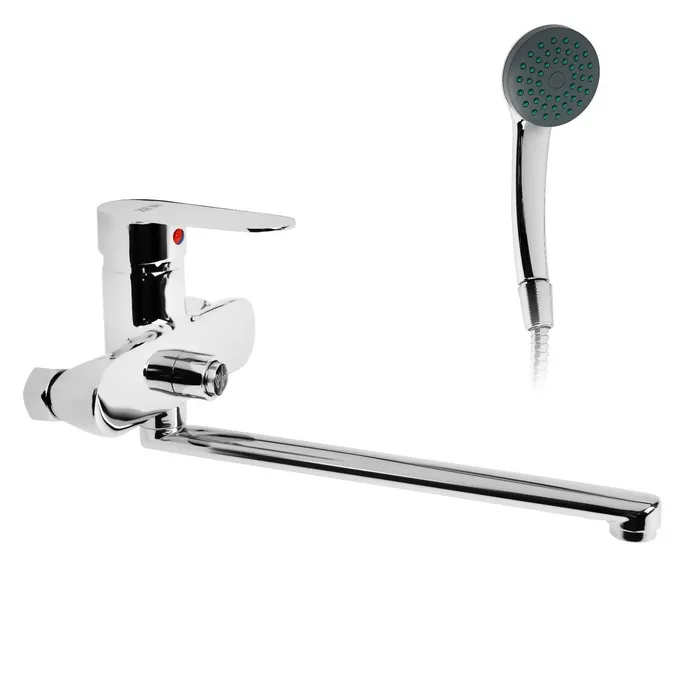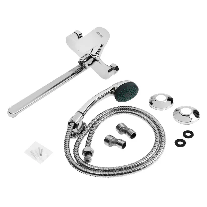 Смеситель для ванны ZEIN Z2741 оснащён изливом длиной 28 см и кнопкой для переключения между режимами, что обеспечивает удобное управление подачей воды.