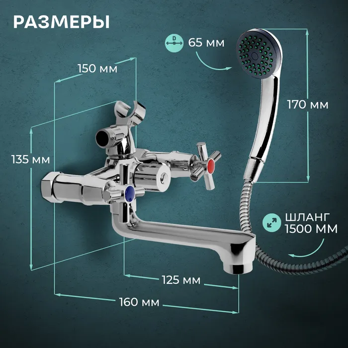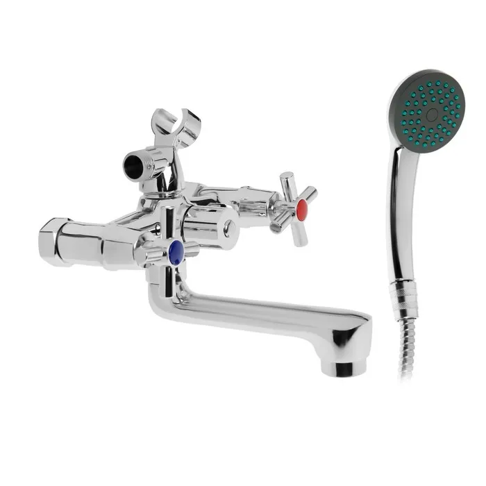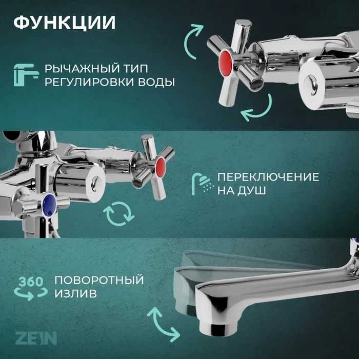 Смеситель для ванны ZEIN Z4051, короткий излив, кран-букса латунь 1/2", душевой набор, хром — Характеристики