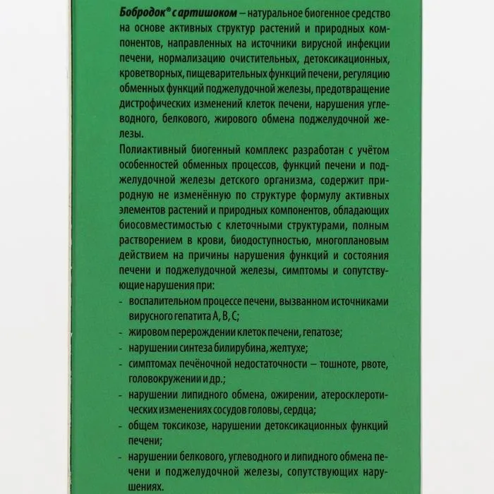 Бобродок с артишоком – полиактивный биогенный комплекс, разработан с учётом особенностей обменных процессов, функций печени и поджелудочной железы детского организма, содержит природную не изменённую по структуре формулу активных элементов растений и природных компонентов, обладающих биосовместимостью с клеточными структурами, полным растворением в крови, биодоступностью, многоплановым действием на причины нарушения функций и состояния печени и поджелудочной железы, симптомы и сопутствующие нарушения при: воспалительном процессе печени, вызванном источниками вирусного гепатита А, В, С. Жировом перерождении клеток печени, гепатозе. Нарушении синтеза билирубина, желтухе. Симптомах печеночной недостаточности – тошноте, рвоте, головокружении и т.д. Нарушении липидного обмена, ожирении, атеросклеротических изменениях сосудов головы, сердца. Общем токсикозе, нарушении детоксикационных функций печени, хронических воспалительных процессах, нарушении функций и состояния органов пищеварительной системы, нарушении состава микрофлоры кишечника, гнилостных процессах, диспепсии, метеоризме. Нарушении белкового, углеводного и липидного обмена печени и поджелудочной железы, сопутствующих нарушениях. Нарушении оттока желчи. Нарушении пищеварительных процессов. Повышенном образовании липопротеидов низкой плотности, превышении их количества в крови и тканях и сопутствующих изменениях. При лекарственном токсикозе печени. При пищевом токсикозе печени.