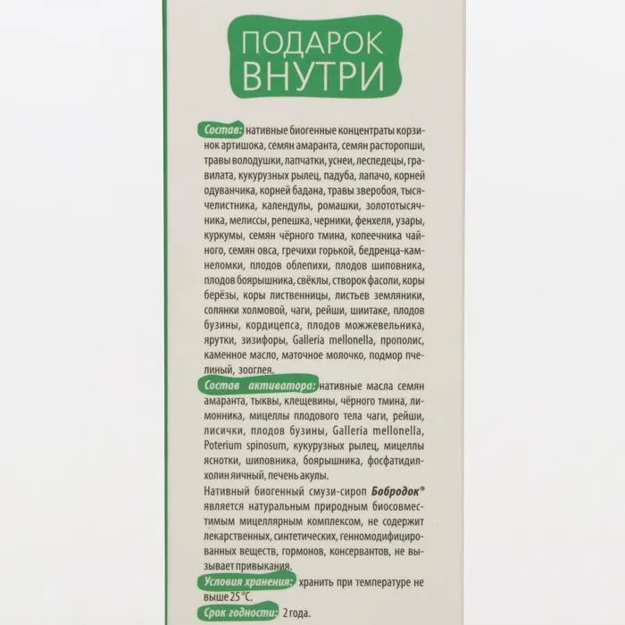 Состав: нативные биогенные концентраты корзинок артишока, семян амаранта, семян расторопши, травы володушки, лапчатки, уснеи, леспедецы, гравилата, кукурузных рылец, падуба, лапачо, корней одуванчика, корней бадана, травы зверобоя, тысячелистника, календулы, ромашки, золототысячника, мелиссы, репешка, черники, фенхеля, узары, куркумы, семян чёрного тмина, копеечника чайного, семян овса, гречихи горькой, бедренца-камнеломки, плодов облепихи, плодов шиповника, плодов боярышника, свеклы, створок фасоли, коры берёзы, коры лиственницы, листьев земляники, солянки холмовой, чаги, рейши, шиитаке, плодов бузины, кордицепса, плодов можжевельника, ярутки, зизифоры, Galleria mellonella, прополис, каменное масло, маточное молочко, подмор пчелиный, зооглея.