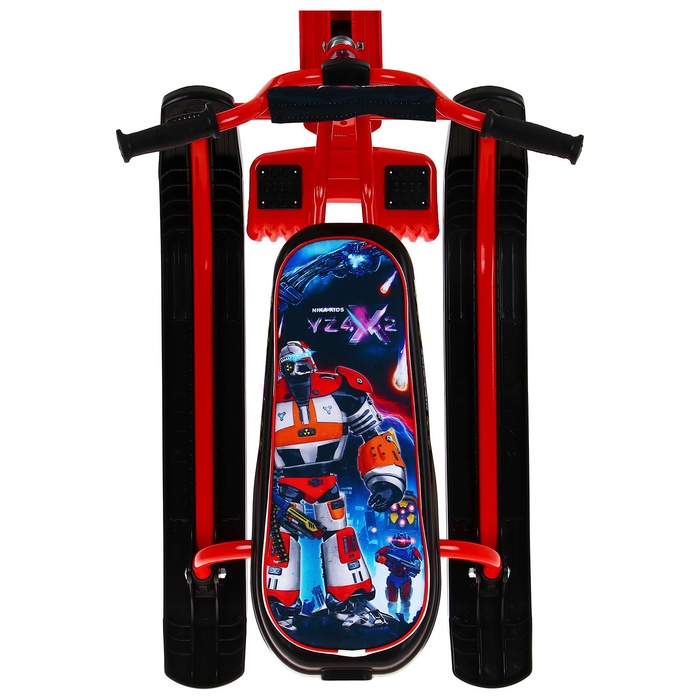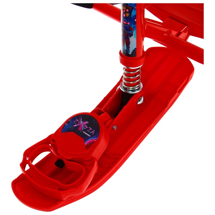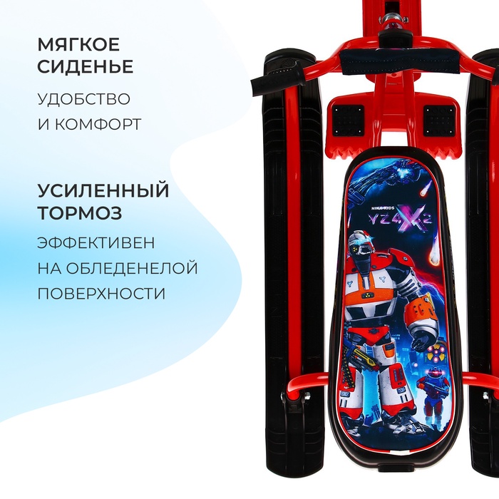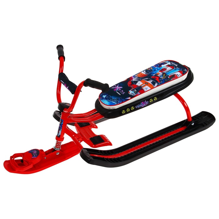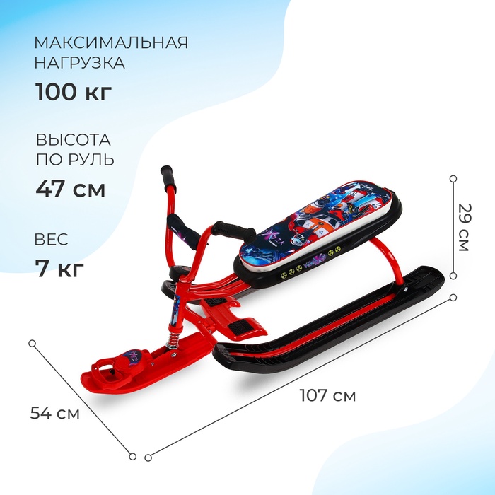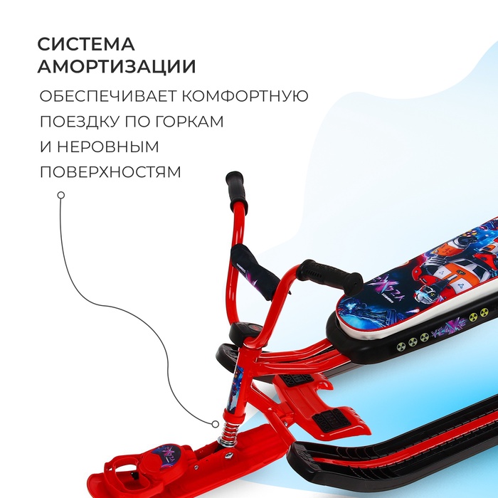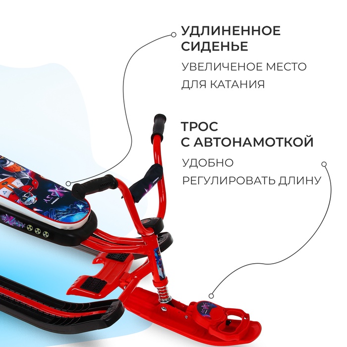 Снегокат предназначен для перевозки детей по плотному снегу или льду, катанию с горок. Имеет сварную конструкцию из стальных труб и пластиковых элементов. Оснащён мягким сиденьем, обтянутым искусственной кожей с рисунком. Оборудован буксировочным тросом с автоматической намоткой и системой амортизации, которая обеспечивает комфортную поездку по крутым горкам и неровным поверхностям. Усиленный тормоз эффективен на обледенелой поверхности.