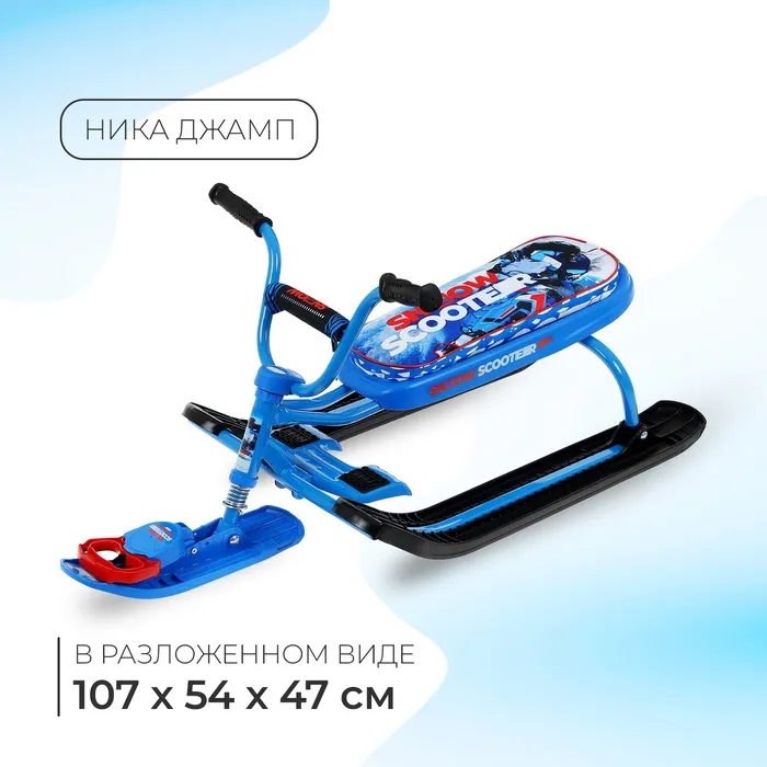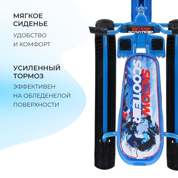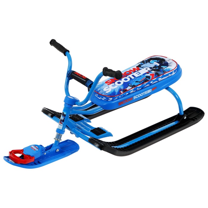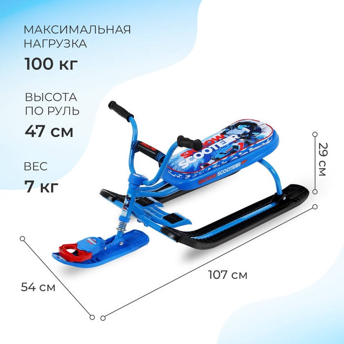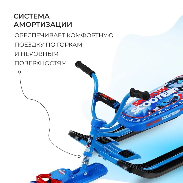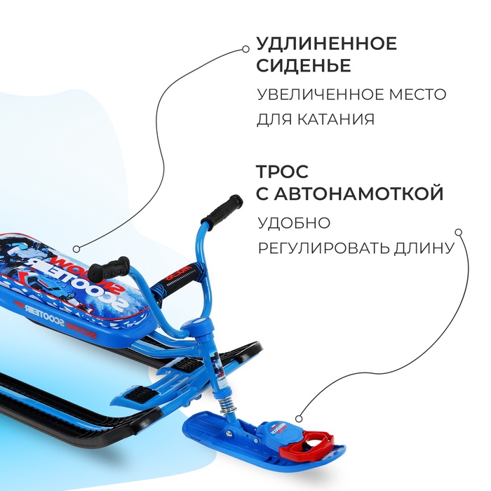 Снегокат предназначен для перевозки детей по плотному снегу или льду, катанию с горок. Имеет сварную конструкцию из стальных труб и пластиковых элементов. Оснащён мягким сиденьем, обтянутым искусственной кожей с рисунком. Оборудован буксировочным тросом с автоматической намоткой и системой амортизации, которая обеспечивает комфортную поездку по крутым горкам и неровным поверхностям. Усиленный тормоз эффективен на обледенелой поверхности.