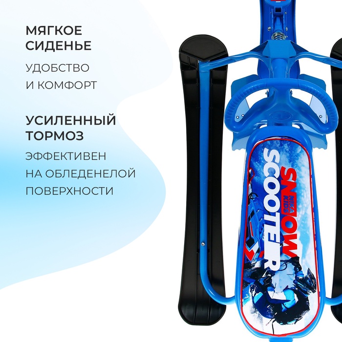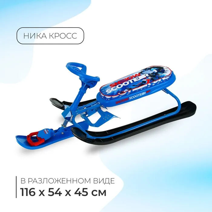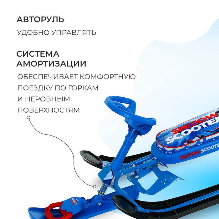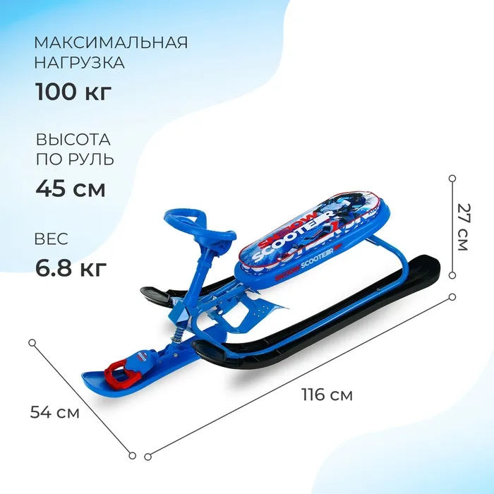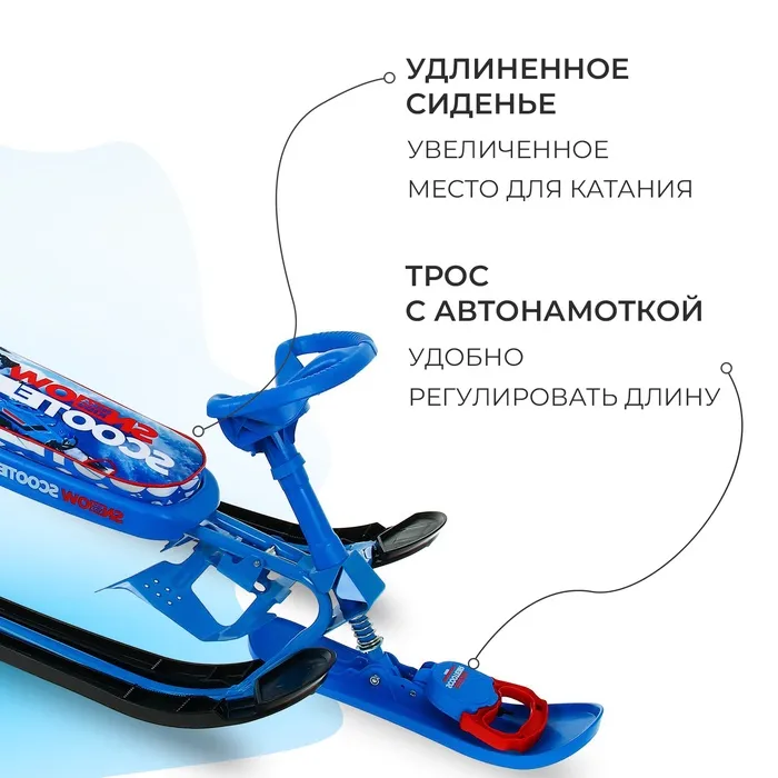 Снегокат предназначен для перевозки детей по плотному снегу или льду, катанию с горок. Имеет сварную конструкцию из стальных труб, пластиковых элементов и мягкое сиденье, обтянутое искусственной кожей с рисунком. Оснащён буксировочным тросом с автоматической намоткой и системой амортизации, которая обеспечивает комфортную поездку по крутым горкам и неровным поверхностям. Усиленный тормоз эффективен на обледенелой поверхности.