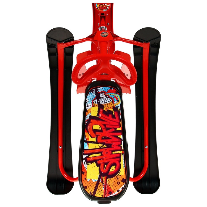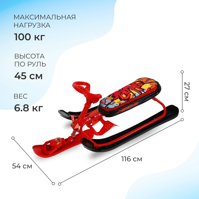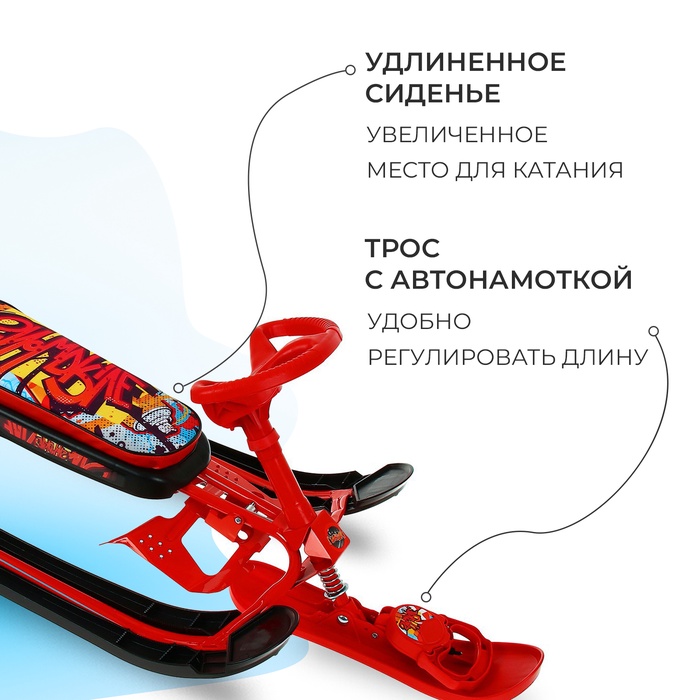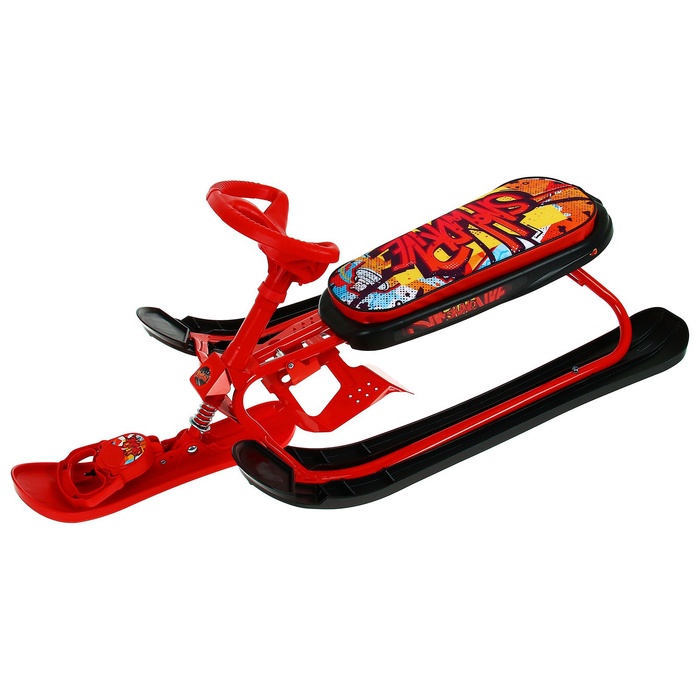 Снегокат предназначен для перевозки детей по плотному снегу или льду, катанию с горок. Имеет сварную конструкцию из стальных труб, пластиковых элементов и мягкое сиденье, обтянутое искусственной кожей с рисунком. Оснащён буксировочным тросом с автоматической намоткой и системой амортизации, которая обеспечивает комфортную поездку по крутым горкам и неровным поверхностям. Усиленный тормоз эффективен на обледенелой поверхности.