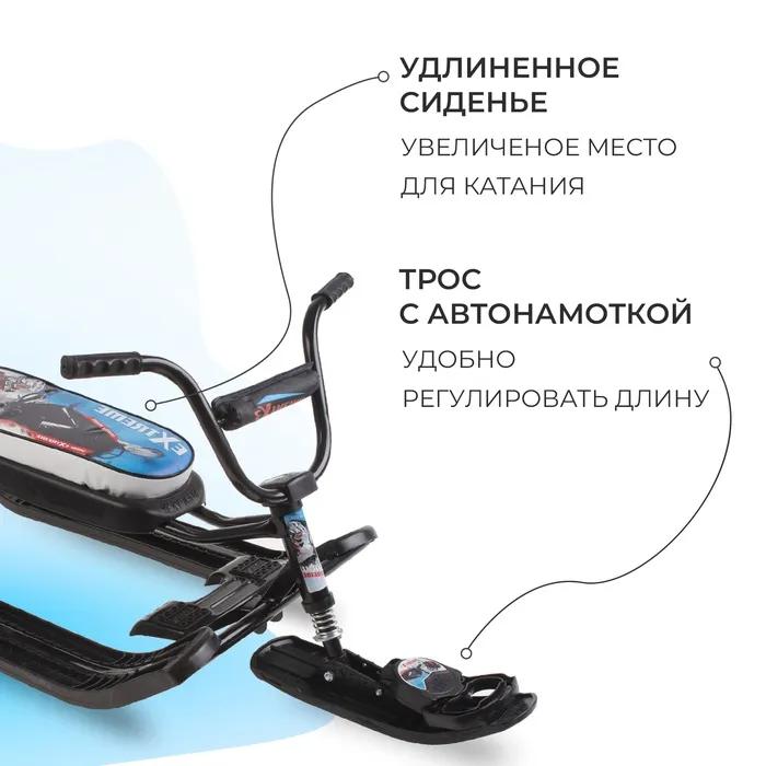 Снегокат предназначен для перевозки детей по плотному снегу или льду, катанию с горок. Имеет сварную конструкцию из стальных труб и пластиковых элементов. Оснащён мягким сиденьем, обтянутым искусственной кожей с рисунком. Оборудован буксировочным тросом с автоматической намоткой и системой амортизации, которая обеспечивает комфортную поездку по крутым горкам и неровным поверхностям. Усиленный тормоз эффективен на обледенелой поверхности.