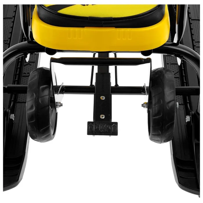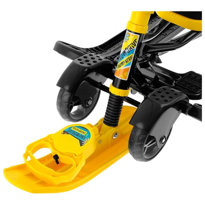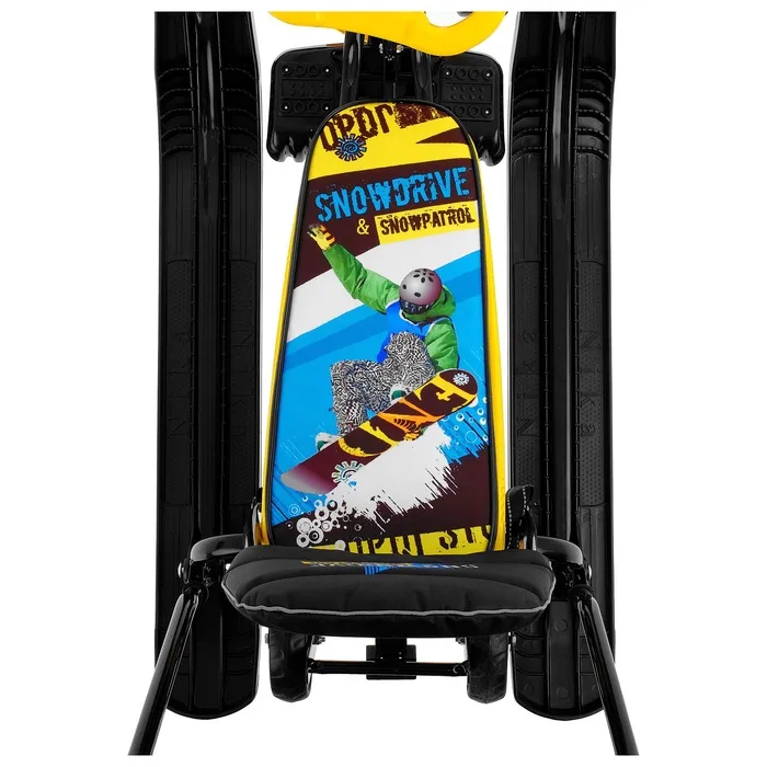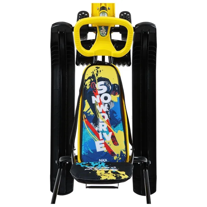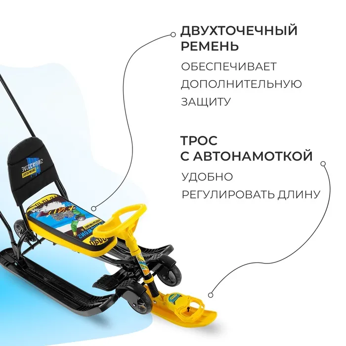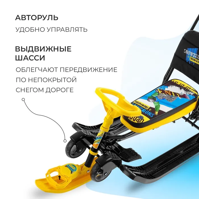 Снегокат предназначен для перевозки детей от 4 до 7 лет по плотному снегу или льду. Имеет сварную конструкцию из стальных труб, пластиковых элементов и мягкое сиденье, обтянутое искусственной кожей с рисунком. Оснащён буксировочным тросом с автоматической намоткой, механизмом выдвижных шасси, родительской ручкой и складной спинкой. Усиленный тормоз эффективен на обледенелой поверхности.