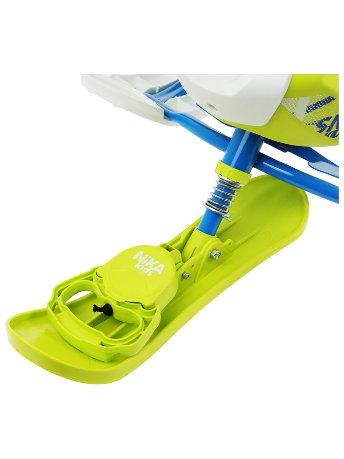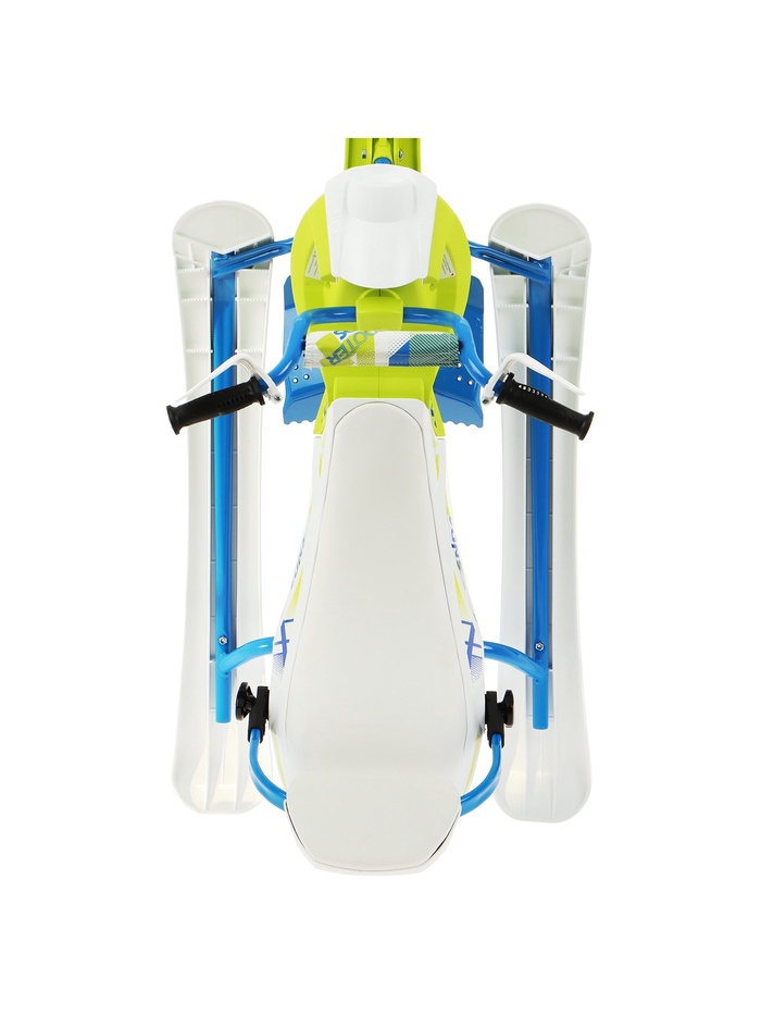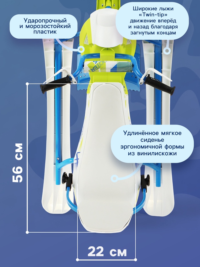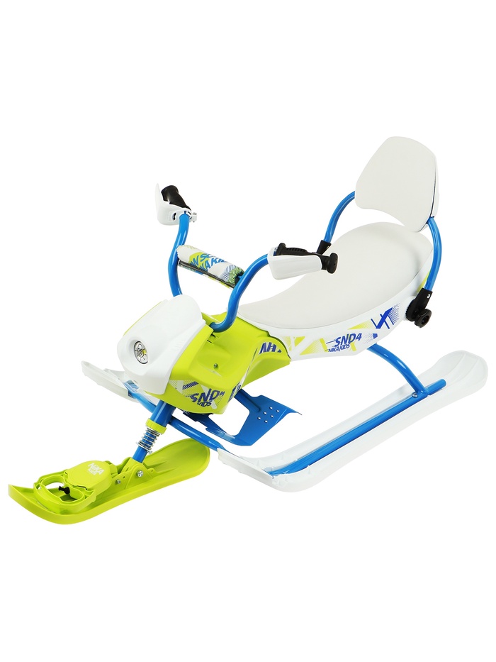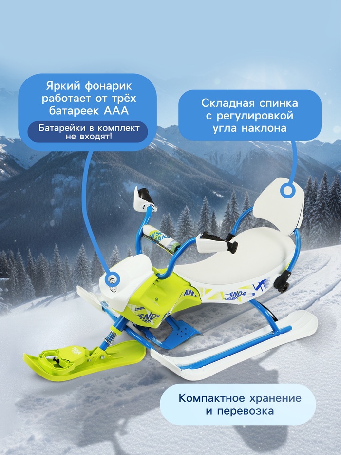 Снегокат предназначен для перевозки детей по плотному снегу или льду. Имеет сварную конструкцию из стальных труб, пластиковых элементов и мягкое удлинённое спортивное сиденье, обтянутое искусственной кожей. Оснащён буксировочным тросом с автоматической намоткой, складной спинкой и системой амортизации, которая обеспечивает комфортную поездку по крутым горкам и неровным поверхностям.