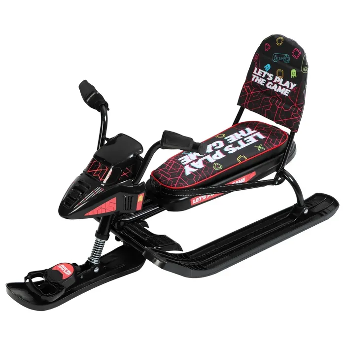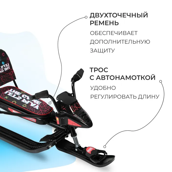 Снегокат предназначен для перевозки детей по плотному снегу, льду, а также для катания с горок. Имеет сварную конструкцию из стальных труб и пластиковых элементов и удлинённое мягкое сиденье. Снегокат оборудован буксировочным тросом с автоматической намоткой и двухточечным ремнём безопасности. Усиленный широкий тормоз эффективен на обледенелой поверхности и высокой скорости. В комплект входит набор наклеек на снегокат.
