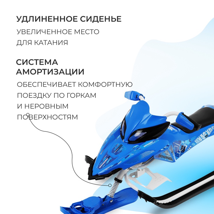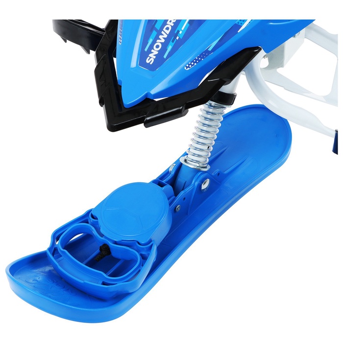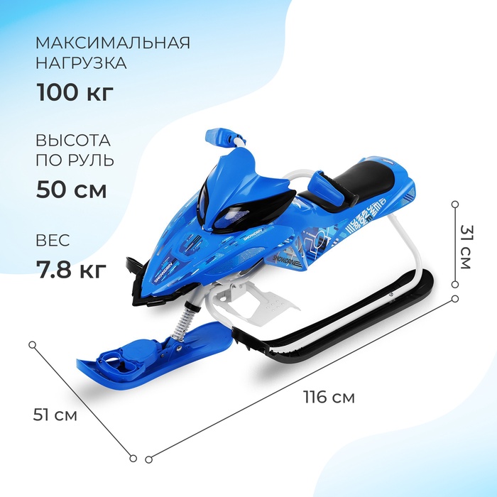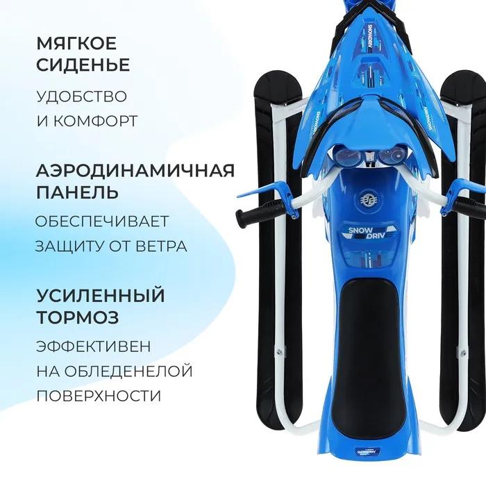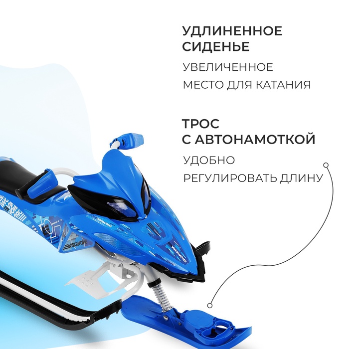 Снегокат предназначен для перевозки детей по снегу или льду, катания с горок. Оснащён пластмассовыми лыжами и мягким сиденьем, обтянутым искусственной кожей. Оборудован буксировочным тросом с автоматической намоткой и системой амортизации, которая обеспечивает комфортную поездку по крутым горкам и неровным поверхностям. Тормоз эффективен на обледенелой поверхности.