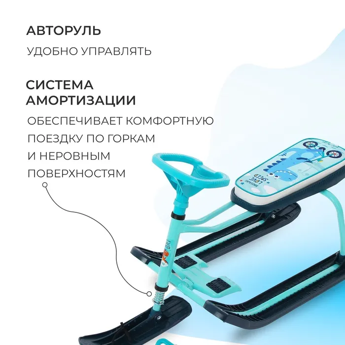 Снегокат предназначен для перевозки детей по плотному снегу или льду, катанию с горок. Имеет сварную конструкцию из стальных труб, пластиковых элементов и мягкое сиденье, обтянутое искусственной кожей с рисунком. Оснащён буксировочным тросом и системой амортизации, которая обеспечивает комфортную поездку по крутым горкам и неровным поверхностям. Усиленный тормоз эффективен на обледенелой поверхности. В комплект входит набор наклеек на снегокат.