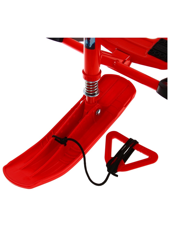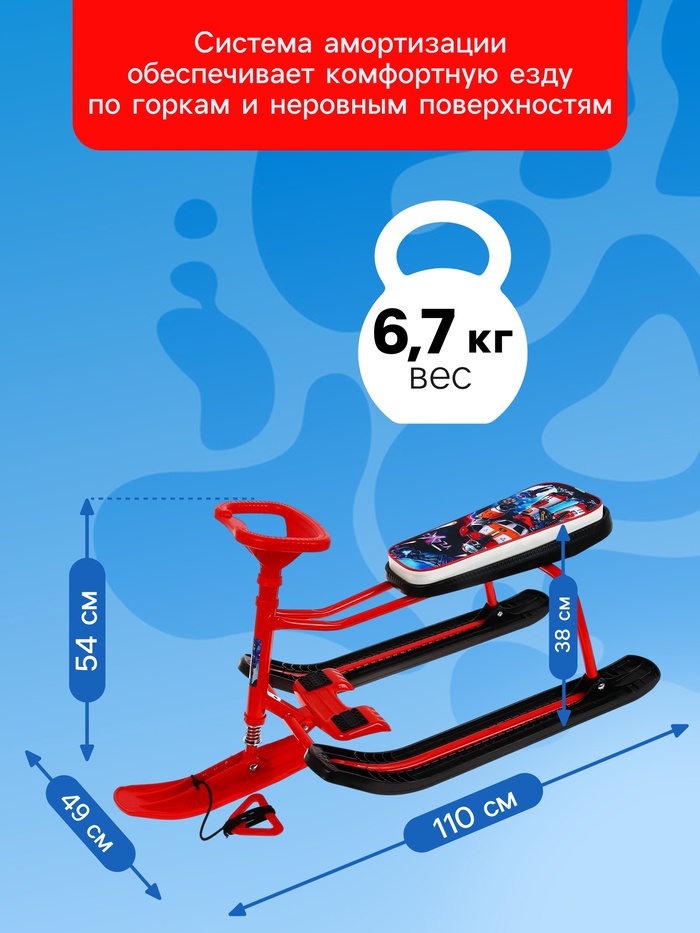 Снегокат предназначен для перевозки детей по плотному снегу или льду, катанию с горок. Имеет сварную конструкцию из стальных труб, пластиковых элементов и мягкое сиденье, обтянутое искусственной кожей с рисунком. Оснащён буксировочным тросом и системой амортизации, которая обеспечивает комфортную поездку по крутым горкам и неровным поверхностям. Усиленный тормоз эффективен на обледенелой поверхности. В комплект входит набор наклеек на снегокат.