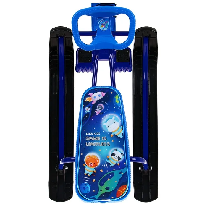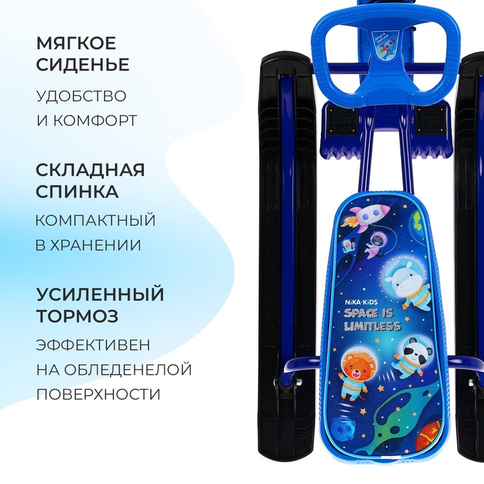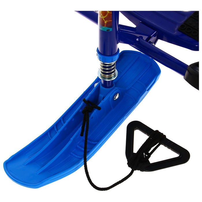 Снегокат предназначен для перевозки детей по плотному снегу или льду, катанию с горок. Имеет сварную конструкцию из стальных труб, пластиковых элементов и мягкое сиденье, обтянутое искусственной кожей с рисунком. Оснащён буксировочным тросом и системой амортизации, которая обеспечивает комфортную поездку по крутым горкам и неровным поверхностям. Усиленный тормоз эффективен на обледенелой поверхности. В комплект входит набор наклеек на снегокат.