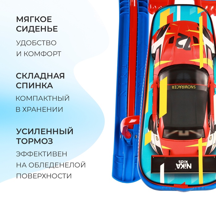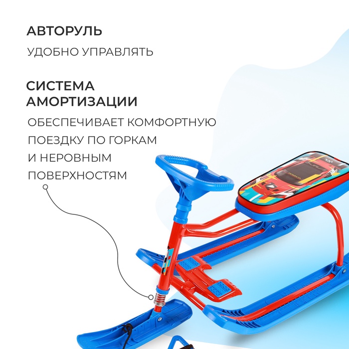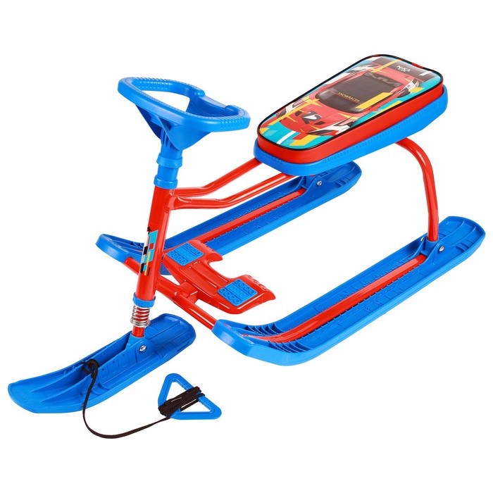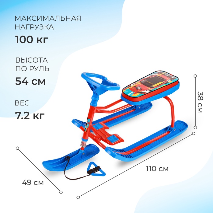 Снегокат предназначен для перевозки детей по плотному снегу или льду, катанию с горок. Имеет сварную конструкцию из стальных труб, пластиковых элементов и мягкое сиденье, обтянутое искусственной кожей с рисунком. Оснащён буксировочным и системой амортизации, которая обеспечивает комфортную поездку по крутым горкам и неровным поверхностям. Усиленный тормоз эффективен на обледенелой поверхности. В комплект входит набор наклеек на снегокат.
