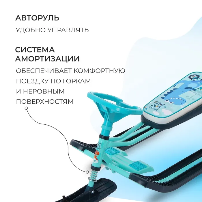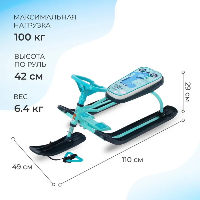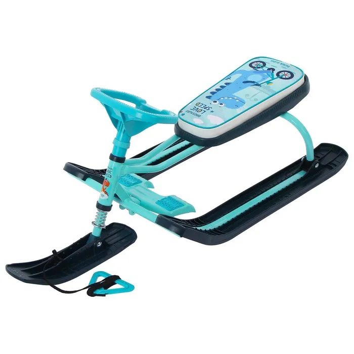 Снегокат предназначен для перевозки детей по плотному снегу или льду, катанию с горок. Имеет сварную конструкцию из стальных труб, пластиковых элементов и мягкое сиденье, обтянутое искусственной кожей с рисунком. Оснащён буксировочным тросом. Усиленный тормоз эффективен на обледенелой поверхности. В комплект входит набор наклеек на снегокат.