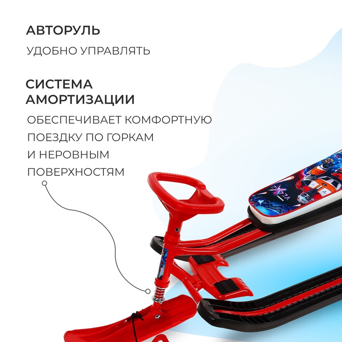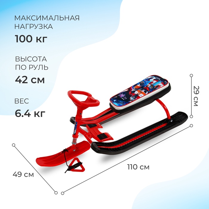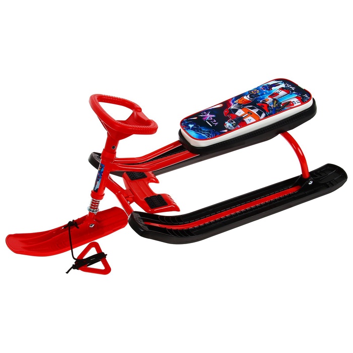 Снегокат предназначен для перевозки детей по плотному снегу или льду, катанию с горок. Имеет сварную конструкцию из стальных труб, пластиковых элементов и мягкое сиденье, обтянутое искусственной кожей с рисунком. Оснащён буксировочным тросом. Усиленный тормоз эффективен на обледенелой поверхности. В комплект входит набор наклеек на снегокат.