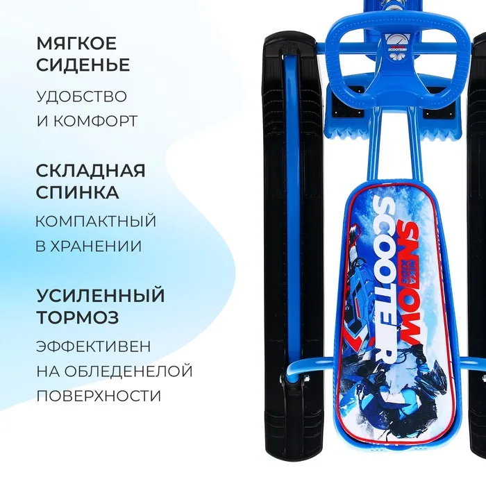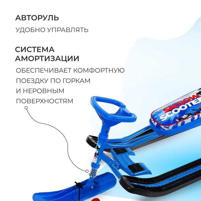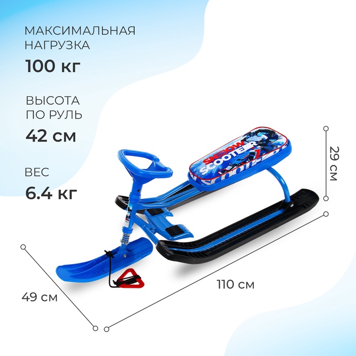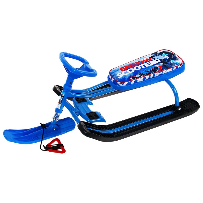 Снегокат предназначен для перевозки детей по плотному снегу или льду, катанию с горок. Имеет сварную конструкцию из стальных труб, пластиковых элементов и мягкое сиденье, обтянутое искусственной кожей с рисунком. Оснащён буксировочным тросом. Усиленный тормоз эффективен на обледенелой поверхности. В комплект входит набор наклеек на снегокат.