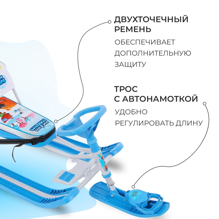 Снегокат предназначен для перевозки детей по плотному снегу или льду, катанию с горок. Имеет сварную конструкцию из стальных труб и пластиковых элементов. Оснащён мягким сиденьем, обтянутым искусственной кожей с рисунком, складной спинкой и двухточечным ремнём безопасности. Оборудован буксировочным тросом с автоматической намоткой и системой амортизации, которая обеспечивает комфортную поездку по крутым горкам и неровным поверхностям. Усиленный тормоз эффективен на обледенелой поверхности.