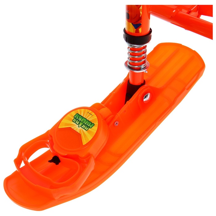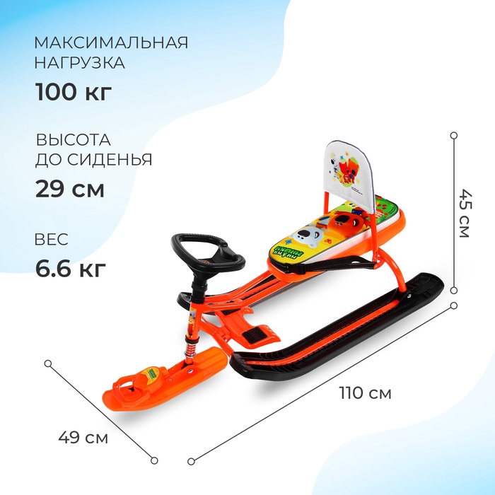 Снегокат предназначен для перевозки детей по плотному снегу или льду, катанию с горок. Имеет сварную конструкцию из стальных труб и пластиковых элементов. Оснащён мягким сиденьем, обтянутым искусственной кожей с рисунком, складной спинкой и 2-точечным ремнём безопасности. Оборудован буксировочным тросом с автоматической намоткой и системой амортизации, которая обеспечивает комфортную поездку по крутым горкам и неровным поверхностям. Усиленный тормоз эффективен на обледенелой поверхности.