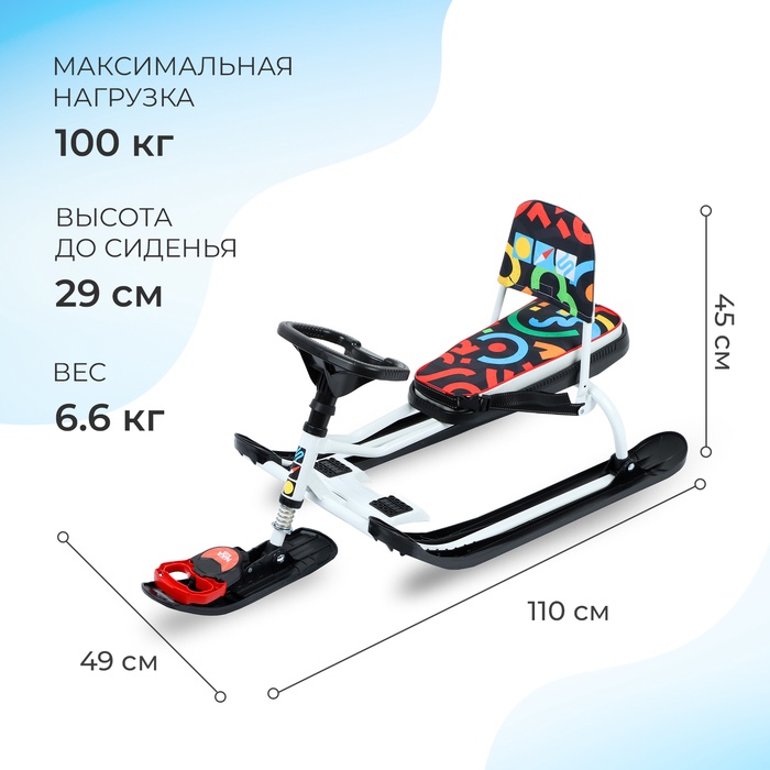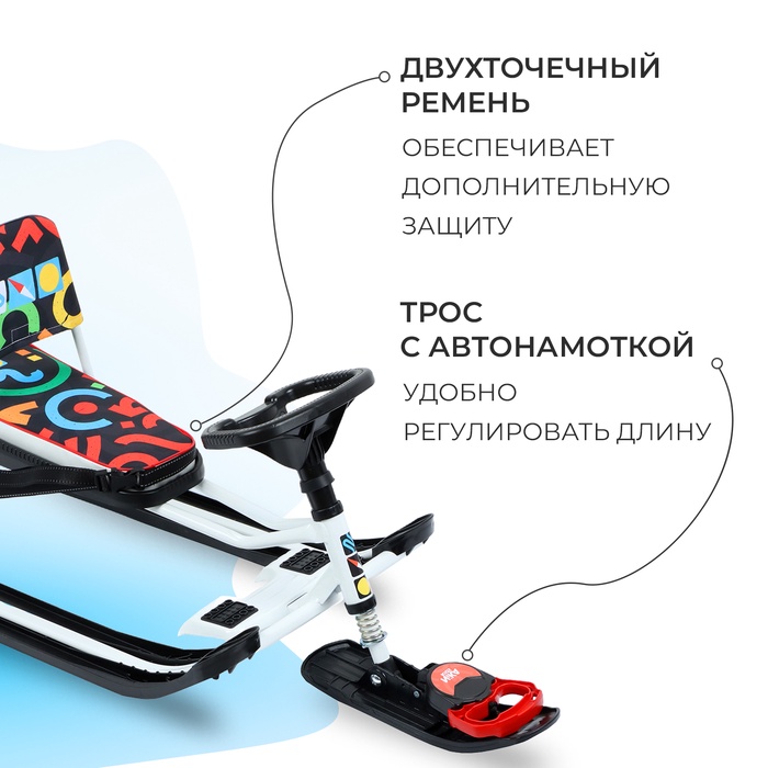 Снегокат предназначен для перевозки детей по плотному снегу или льду, а также для катания с горок. Имеет сварную конструкцию из стальных труб, пластиковых элементов и мягкое сиденье. Снегокат оборудован буксировочным тросом с автоматической намоткой и двухточечным ремнём безопасности. Усиленный тормоз эффективен на обледенелой поверхности и высокой скорости. В комплект входит набор наклеек на снегокат.