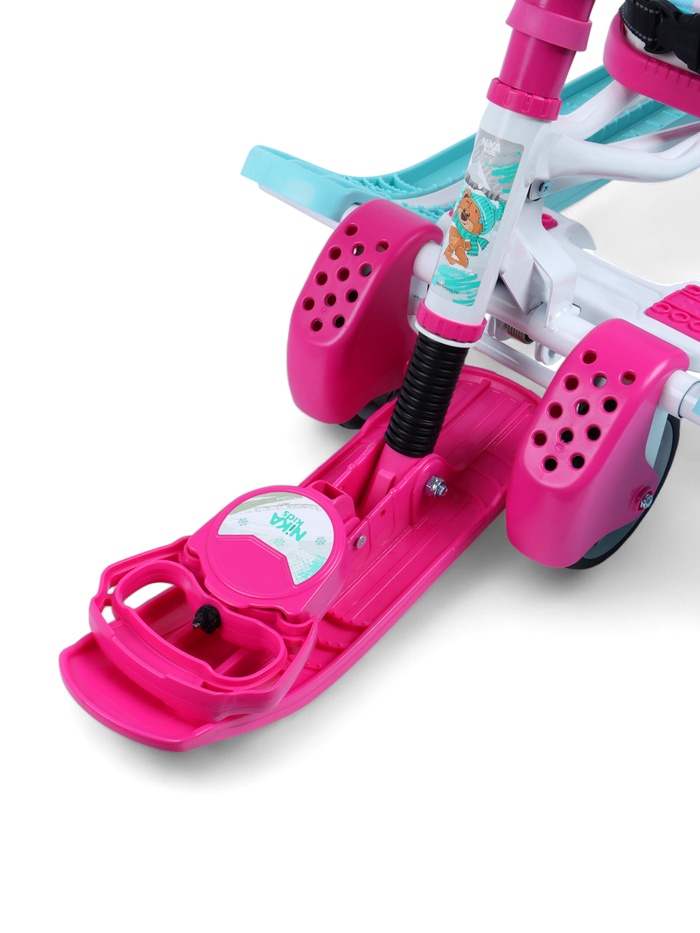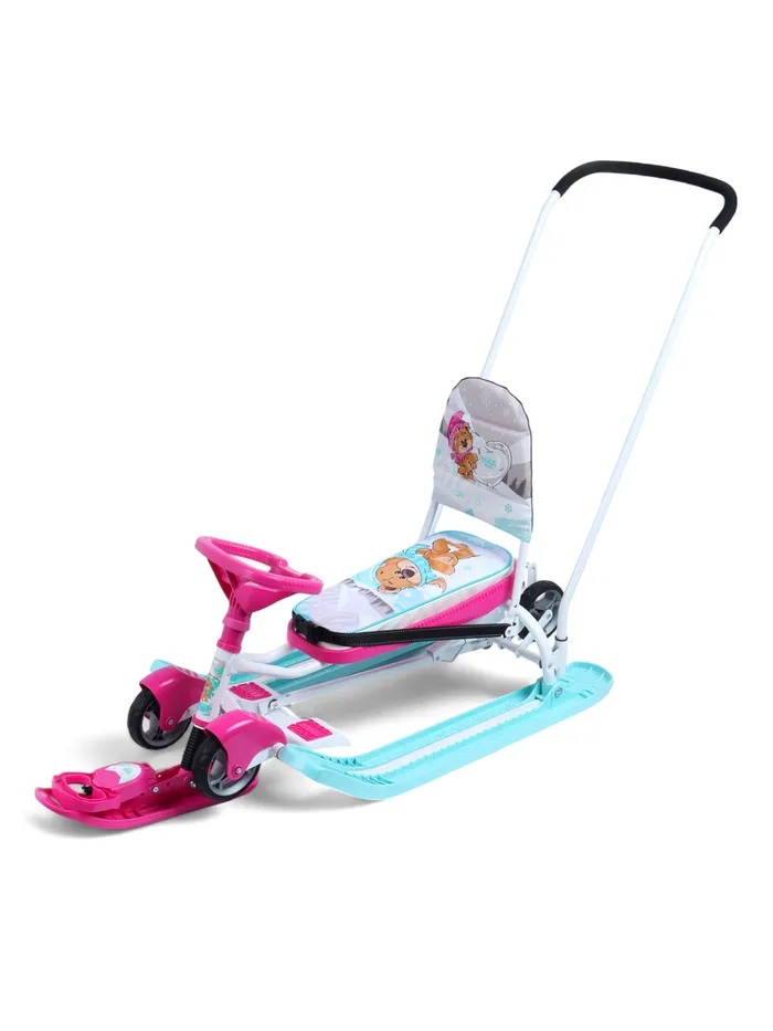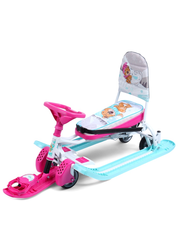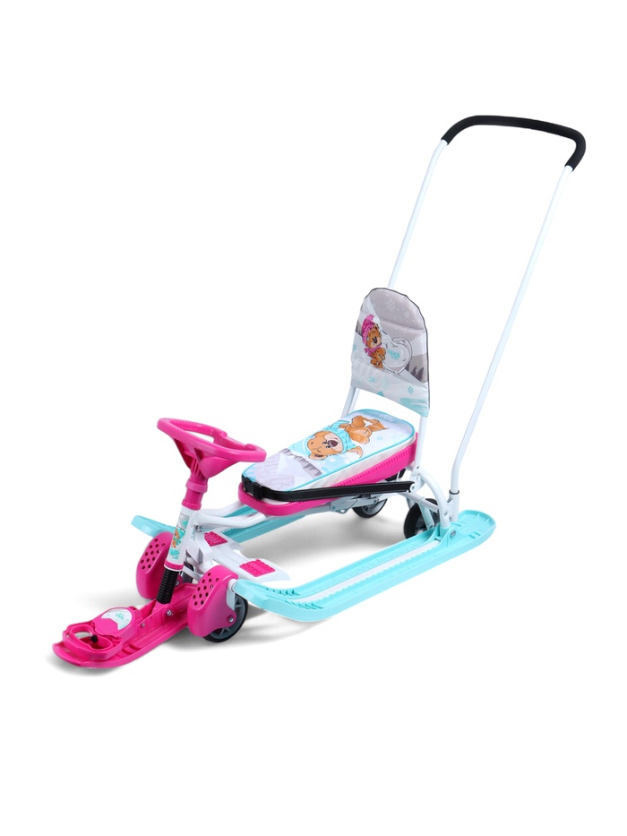 Снегокат предназначен для перевозки детей по плотному снегу, льду или более твёрдой поверхности, а также для катания с горок. Имеет сварную конструкцию из стальных труб и пластиковых элементов и удлинённое мягкое сиденье. Снегокат оборудован буксировочным тросом с автоматической намоткой и двухточечным ремнём безопасности. Выдвижные шасси облегчают передвижение по непокрытой снегом дороге, такой как асфальт или грунт. Родительская ручка позволяет легко управлять транспортом. Усиленный широкий тормоз эффективен на обледенелой поверхности и высокой скорости. В комплект входит набор наклеек на снегокат.