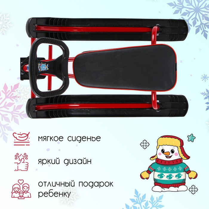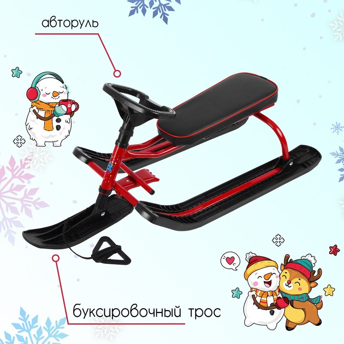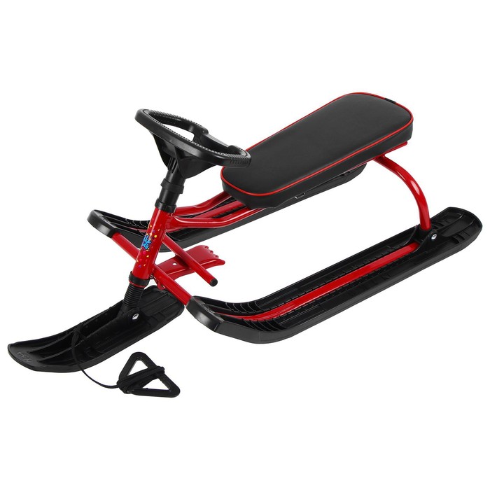 Снегокат предназначен для перевозки детей по плотному снегу или льду, катанию с горок. Имеет сварную конструкцию из стальных труб, пластиковых элементов и мягкое сиденье, обтянутое искусственной кожей. Оснащён буксировочным тросом. Тормоз эффективен на обледенелой поверхности.