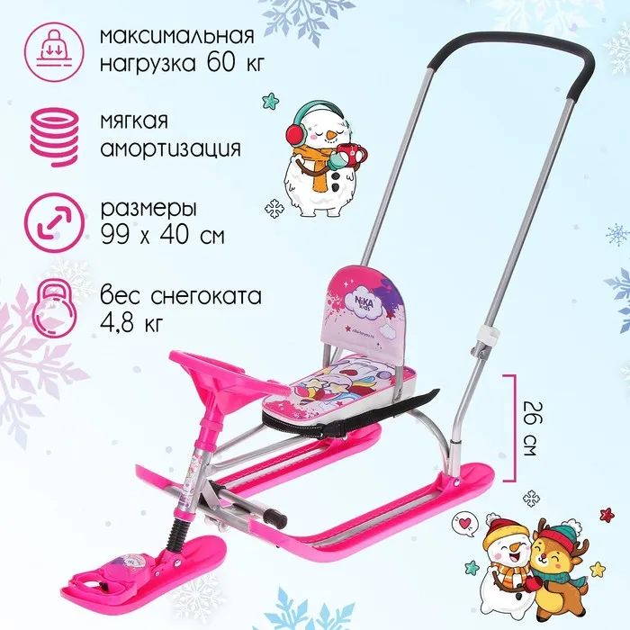 Снегокат предназначен для перевозки детей по плотному снегу или льду, катанию с горок. Имеет сварную конструкцию из стальных труб и пластиковых элементов. Оснащён мягким сиденьем, обтянутым искусственной кожей с рисунком, складной спинкой, двухточечным ремнём безопасности и родительской ручкой. Оборудован буксировочным тросом. Тормоз эффективен на обледенелой поверхности.