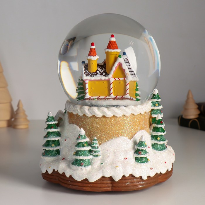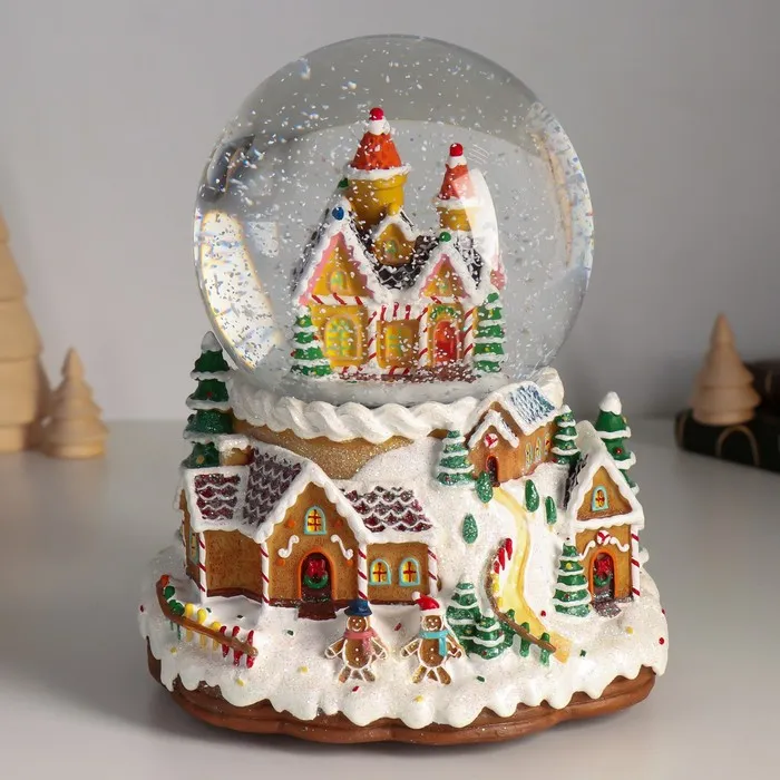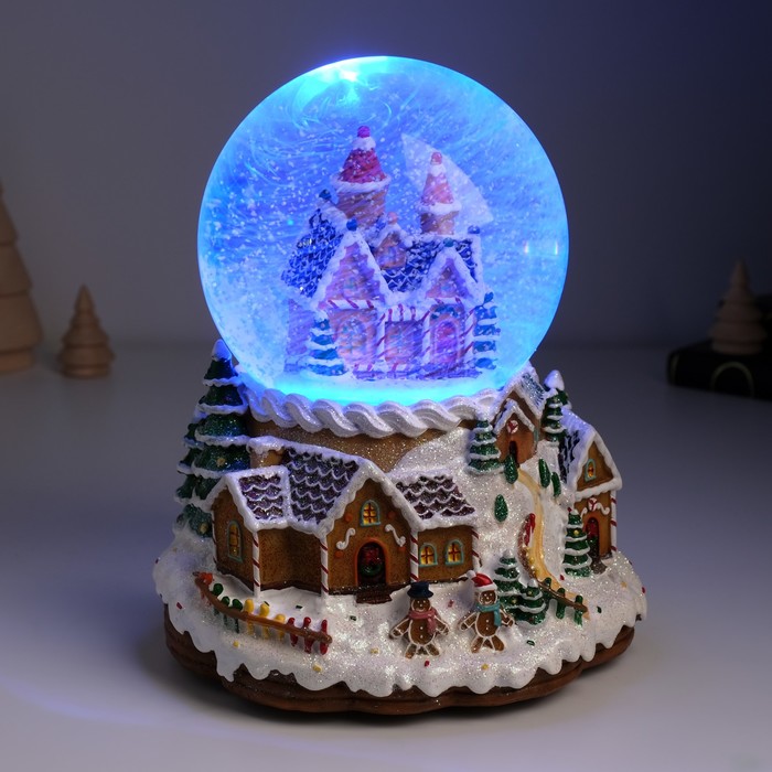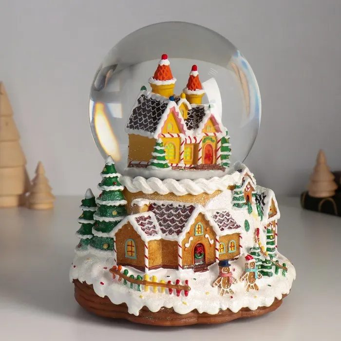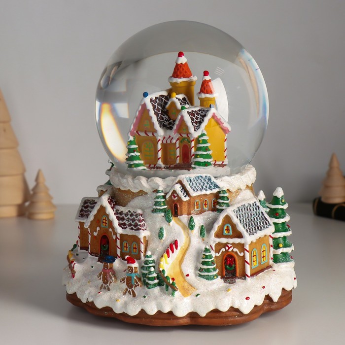 Снежный шар новогодний стеклянный «Пряничный город», музыкальный, световой, d=12 см, 16.5×16.5×19.5 см — Характеристики