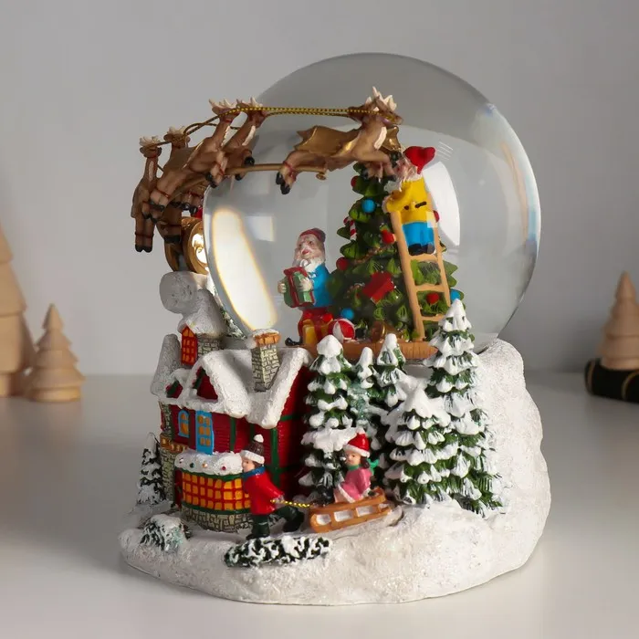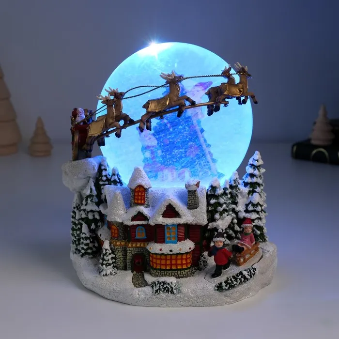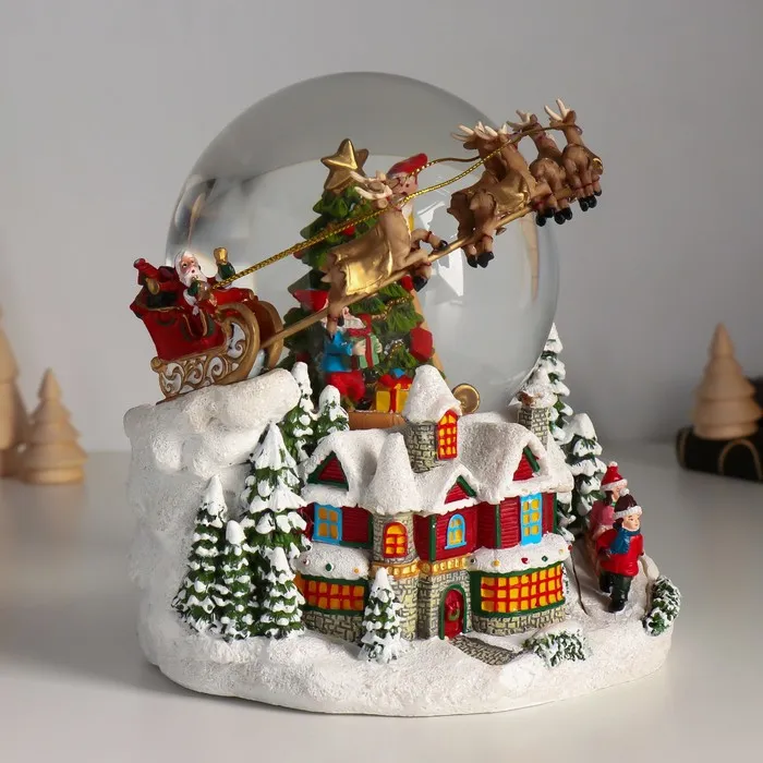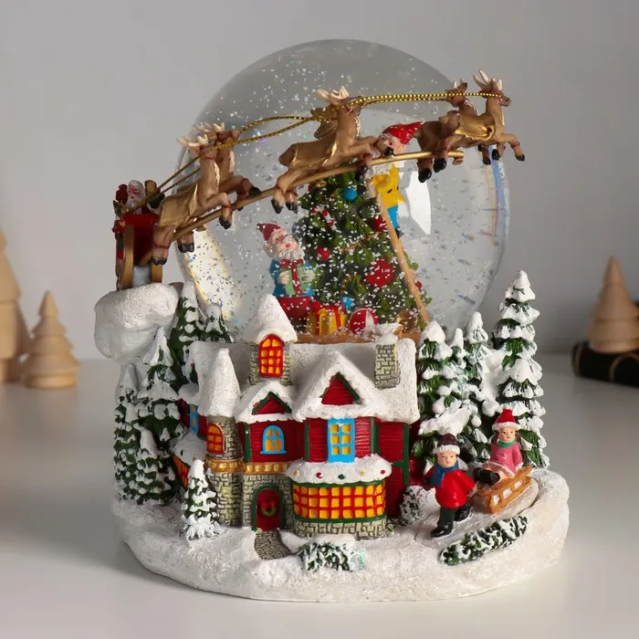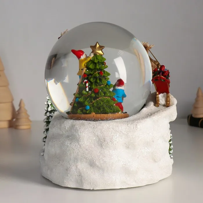 Снежный шар новогодний стеклянный «Сани Деда Мороза», музыкальный, световой, d=12 см, 17×16.5×17.5 см — Характеристики