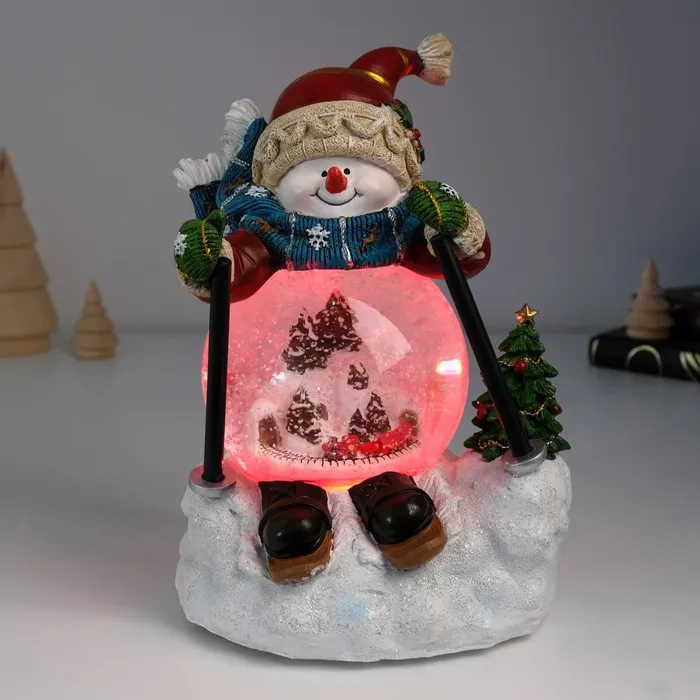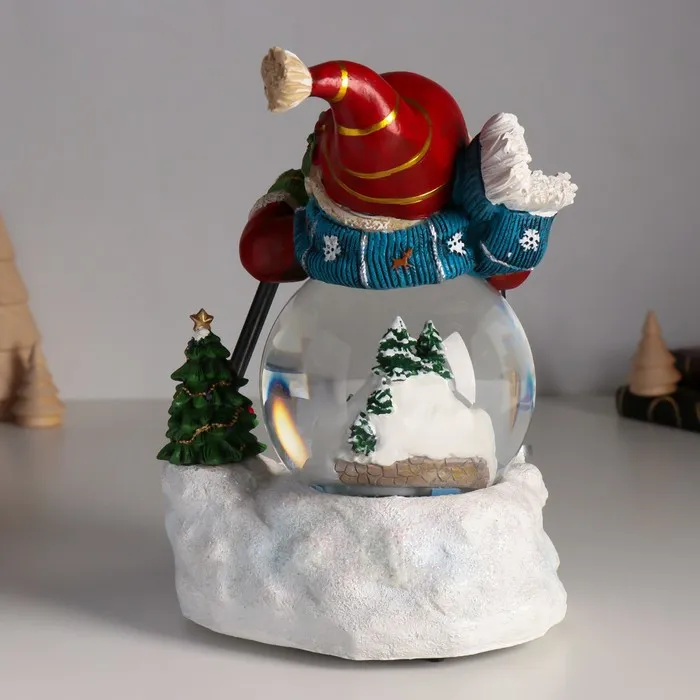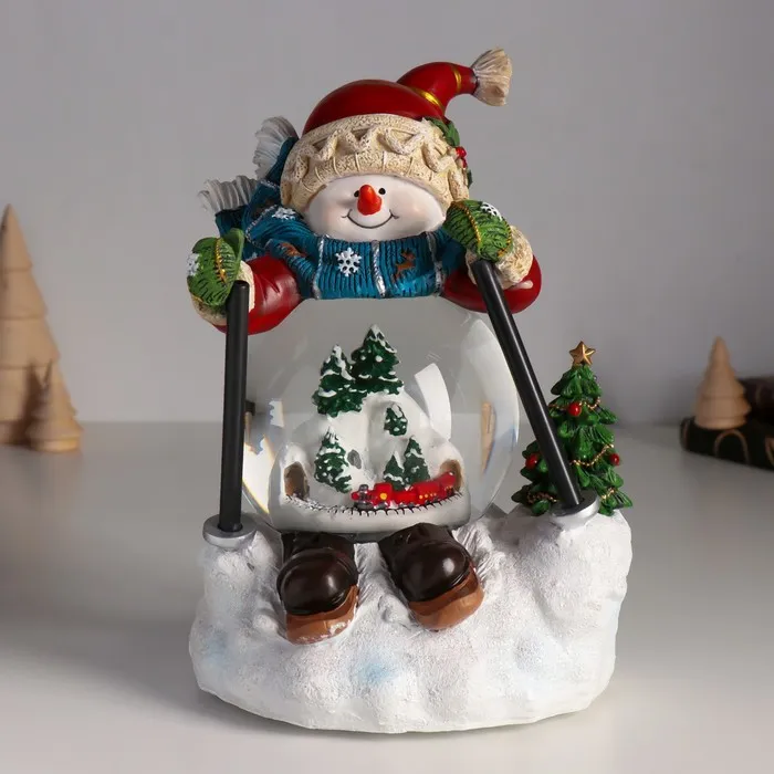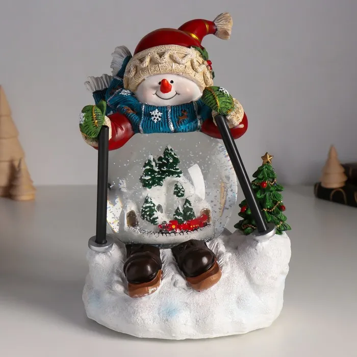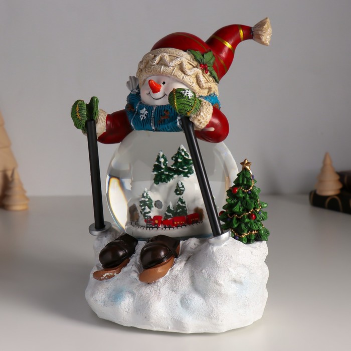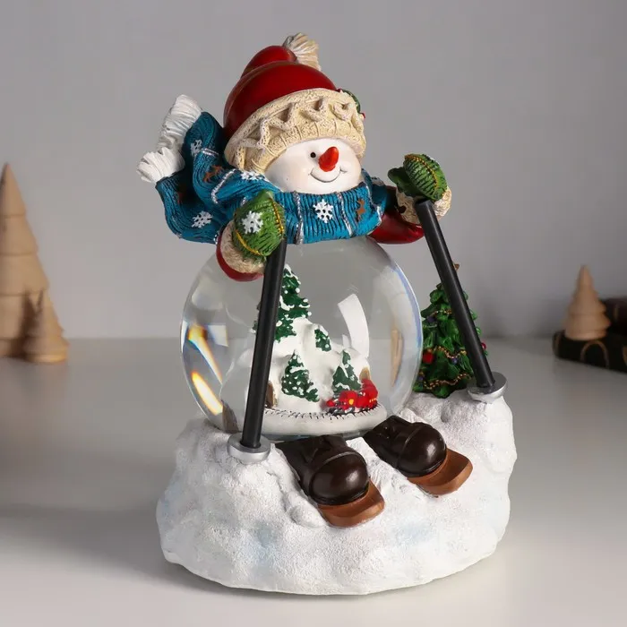 Снежный шар новогодний стеклянный «Снеговичок на лыжа×», музыкальный, световой, d=10 см, 15×13.5×21 см — Характеристики