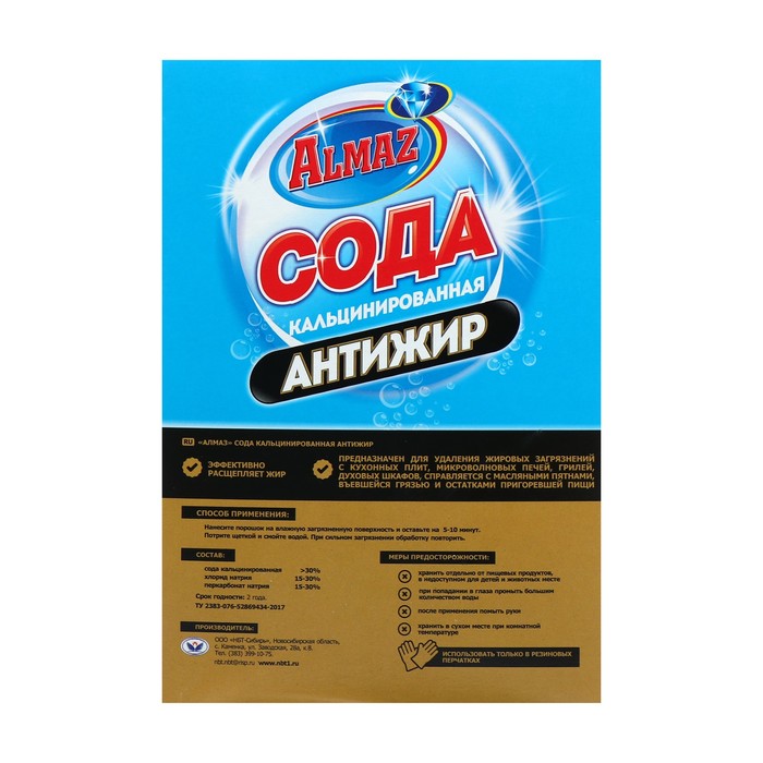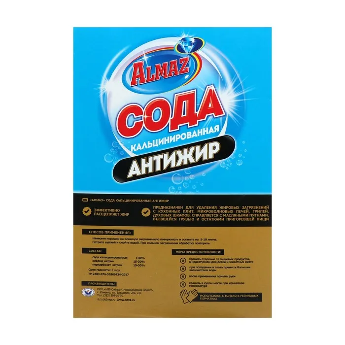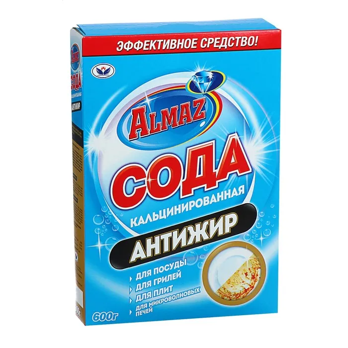 Алмаз Сода кальцинированная универсальное чистящее и моющее средство. Применяется для удаления жировых загрязнений с кухонных плит, микроволновых печей, грилей, духовых шкафов, справляется с масляными пятнами, въевшейся грязью и остатками пригоревшей пищи.