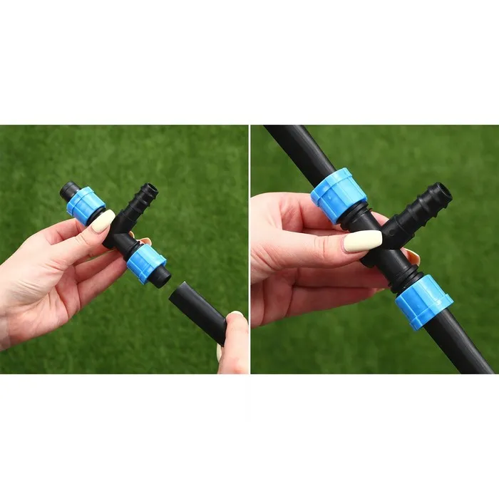 Изделие поможет соединить 2 капельные ленты диаметром 16 мм и шланг диаметром 1/2" (12 мм).
