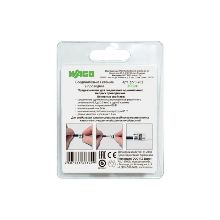 Соединительная клемма WAGO 2-х проводная (2273-202) 20 шт. в блистере — Характеристики