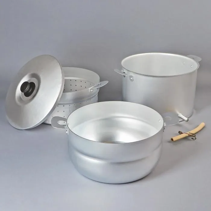 Посуда изготовлена из алюминия пищевого без покрытия. Соковарка очень легко разбирается, собирается и моется. Её конструкция состоит из нескольких модулей: базовой кастрюли, ёмкости для сбора готового сока, сетки для загрузки свежих плодов и глубокой крышки.