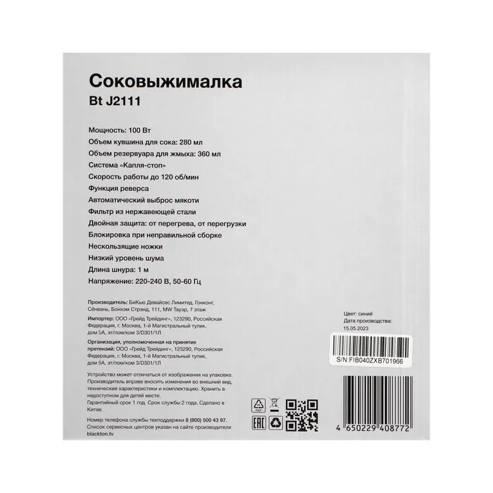 Соковыжималка Blackton Bt J2111, шнековая, 100 Вт, 0.28/0.36 л, тёмно-синяя — Характеристики