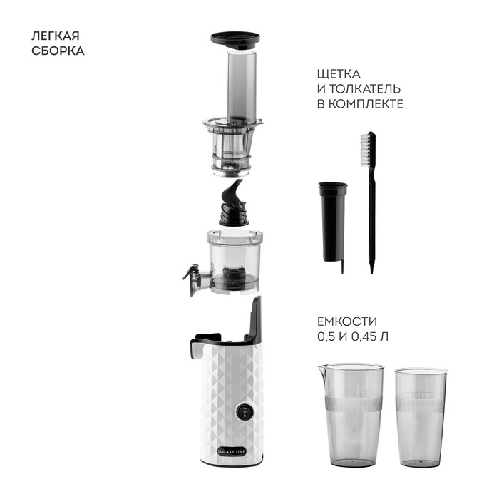 Благодаря продуманной конструкции сборка и разборка соковыжималки займет меньше минуты.