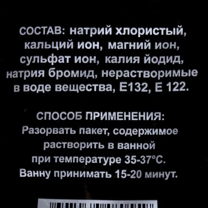 Способ применения: для принятия ванны рекомендуется растворить 600 — 1000 грамм соли в воде комфортной температуры. Продолжительность принятия ванны 15-20 минут.